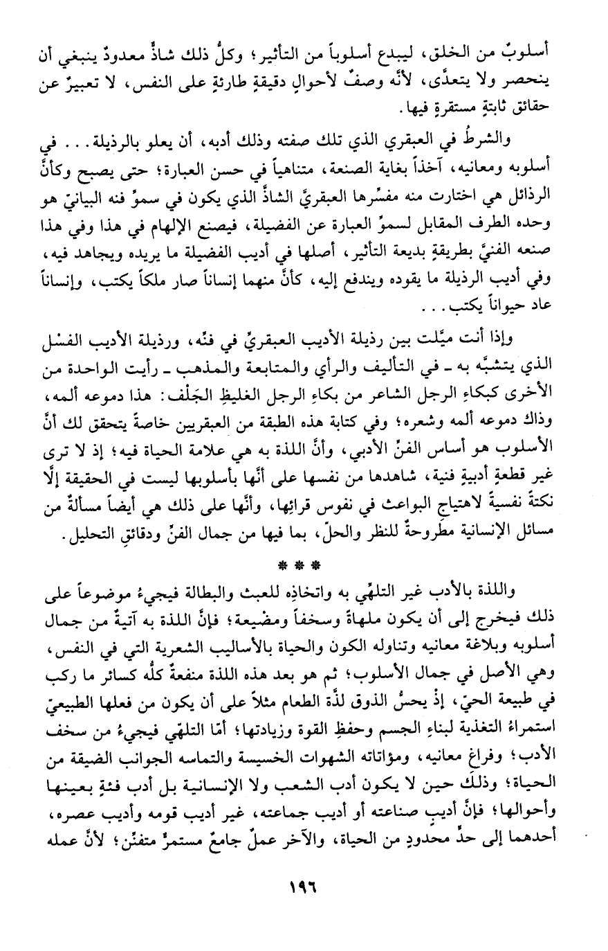 وإذا أنت ميَّلت بين رذيلة الأديب العبقري في فنه، ورذيلة الأديب الفسل الذي يتشبه به -في التأليف والرأي والمتابعة والمذهب- رأيت الواحدة من الأخرى كبكاء الرجل الشاعر من بكاء الرجل الغليظ الجلف: هذا دموعه ألمه، وذاك دموعه ألمه وشعره؛ وفي كتابة هذه الطبقة من العبقريين خاصة يتحقق لك أن الأسلوب هو أساس الفن الأدبي، وأن اللذة به هي علامة الحياة فيه؛ إذ لا ترى غير قطعية أدبية فنية، شاهدها من نفسها على أنها بأسلوبها ليست في الحقيقة إلا نكتة نفسية لاهتياج البواعث في نفوس قرائها، وأنها على ذلك هي أيضًا مسألة من مسائل الإنسانية مطروحة للنظر والحل، بما فيها من جمال الفن ودقائق التحليل.