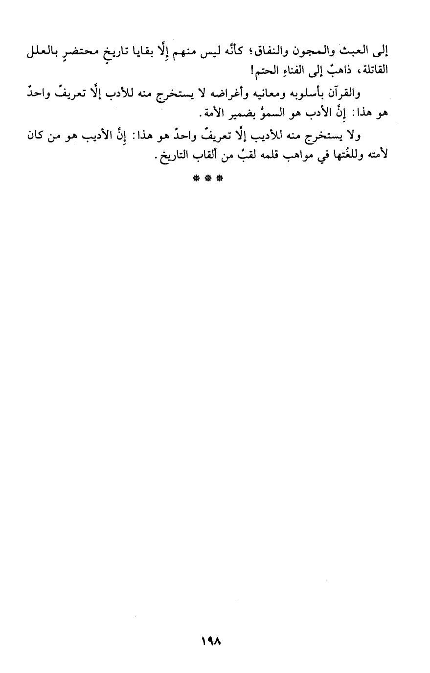 ولا يستخرج منه للأديب إلا تعريف واحد هو هذا: إن الأديب هو من كان لأمته وللغتها في مواهب قلمه لقب من ألقاب التاريخ.