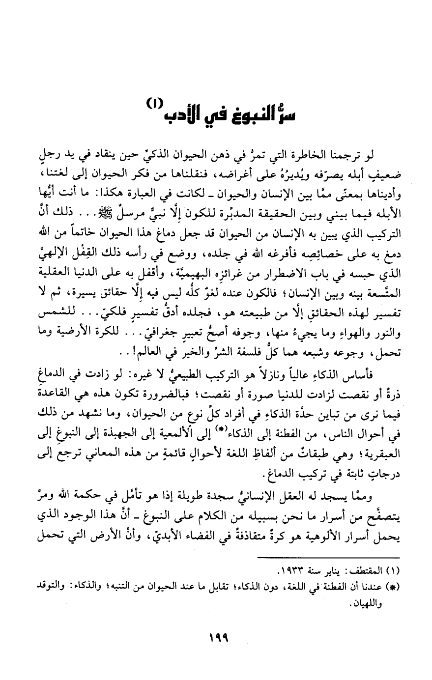 لو ترجمنا الخاطرة التي تمر في ذهن الحيوان الذكي حين ينقاد في يد رجل ضعيف أبله يصرفه ويديره على أغراضه، فنقلناها من فكر الحيوان إلى لغتنا، وأديناها بمعنى مما بين الإنسان والحيوان -لكانت في العبارة هكذا: ما أنت أيها الأبله فيما يبني وبين الحقيقة المدبرة للكون إلا نبي مرسل صلى الله عليه وسلم ... ذلك أن التركيب الذي يبين به الإنسان من الحيوان قد جعل دماغ هذا الحيوان خاتمًا من الله دمغ به على خصائصه فأفرغه الله في جلده، ووضع في رأسه ذلك القفل الإلهي الذي حبسه في باب الاضطرار من غرائزه البهيمية، وأقفل به على الدنيا العقلية المتسعة بينه وبين الإنسان؛ فالكون عنده لغو كله ليس فيه إلا حقائق يسيرة، ثم لا تفسير لهذه الحقائق إلا من طبيعته هو، فجلده أدق تفسير فلكي ... للشمس والنور والهواء وما يجيء منها؛ وجوفه أصح تعبير جغرافي ... للكرة الأرضية وما تحمل، وجوعه وشبعه هما كل فلسفة الشر والخير في العالم! ...
