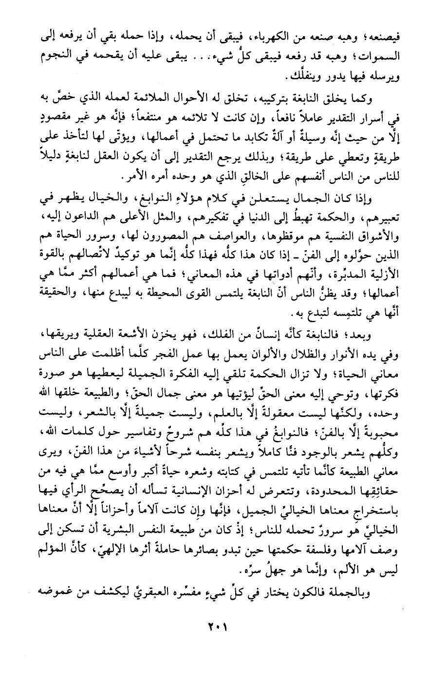وإذا كان الجمال يستعلن في كلام هؤلاء النوابغ، والخيال يظهر في تعبيرهم، والحكمة تهبط إلى الدنيا في تفكيرهم، والمثل الأعلى هم الداعون إليه، والأشواق النفسية هم موقظوها، والعواطف هم المصورون لها، وسرور الحياة هم الذين حولوه إلى الفن -إذا كان هذا كله فهذا كله إنما هو توكيد لاتصالهم بالقوة الأزلية المدبرة، وأنهم أدواتها في هذه المعاني؛ فما هي أعمالهم أكثر مما هي أعمالها؛ وقد يظن الناس أن النابغة يلتمس القوى المحيط به ليبدع منها، والحقيقة أنها هي تلتمسه لتبدع به.
