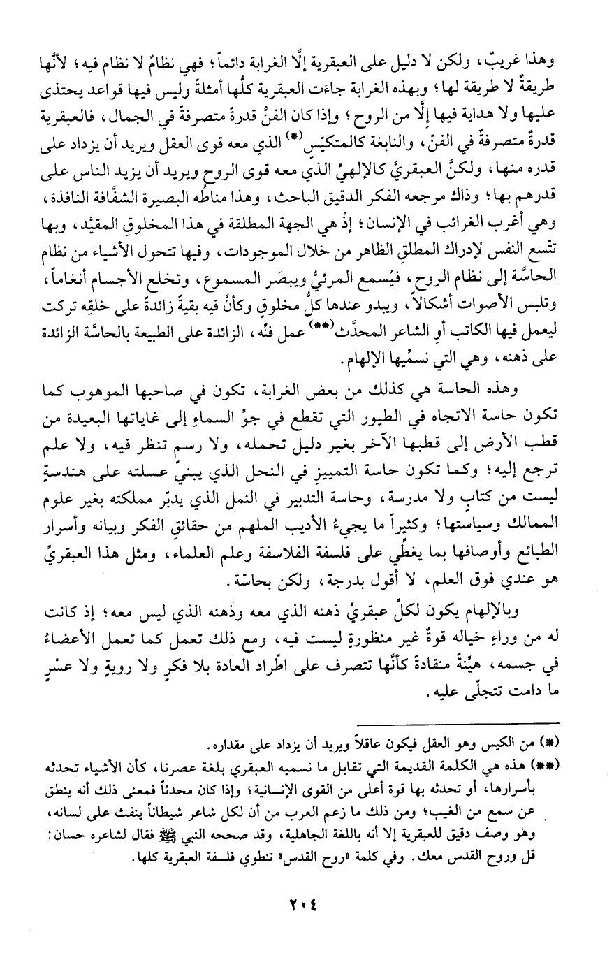 وهذا غريب، ولكن لا دليل على العبقرية إلا الغرابة دائما؛ فهي نظام لا نظام فيه؛ لأها طريقة لا طريقة لها؛ وبهذه الغرابة جاءت العبقرية كلها أمثلة وليس فيها قواعد يحتذى عليها ولا هداية فيها إلا من الروح؛ وإذا كان الفن قدرة متصرفة في الجمال، فالعبقرية قدرة متصرفة في الفن، والنابغة كالمتكيس* الذي معه قوي العقل ويريد أن يزداد على قدره منها، ولكن العبقري كالإلهي الذي معه قوى الروح ويريد أن يزيد الناس على قدرهم بها؛ وذاك مرجعه الفكر الدقيق الباحث؛ وهذا مناطه البصيرة الشفافة النافذة، وهي أغرب الغرائب في الإنسان؛ إذ هي الجهة المطلقة في هذا المخلوق المقيد، وبها تتسع الناس لإدراك المطلق الظاهر من خلال الموجودات، وفيها تتحول الأشياء من نظام الحاسة إلى نظام الروح فيسمع المرئي ويبصر المسموع، وتخلع الأجسام أنغاما، وتلبس الأصوات أشكالا، ويبدو عندها كل مخلوق وكأن فيه بقية زائدة على خلقه تركت ليعمل فيها الكاتب أو الشاعر المحدث2 عمل فنه، الزائد على الطبيعة بالحاسة الزائدة على ذهنه، وهي التي نسميها الإلهام.