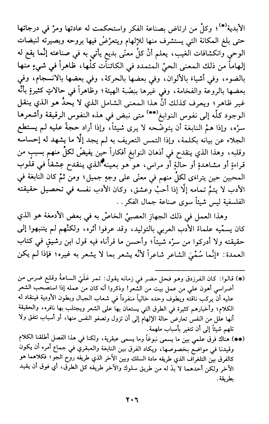 الأبدية*؛ وكل من ارتاض بصناعة الفكر واستحكمت له عادتها ومر في درجاتها حتى بلغ المكانة التي يستشرف منها للإلهام ويتعرض فيها بروحه وبصيرته لنبضات الوحي وانكشافات الغيب، يعلم أن كل معنى بديع يأتي به في صناعته إنما يقع له إلهامًا من ذلك المعنى الحي المتمدد في الكائنات كلها، ظاهرًا في شيء منها بالضوء، وفي أشياء بالألوان، وفي بعضها بالحركة، وفي بعضها بالانسجام، وفي بعضها بالروعة والفخامة، وفي غيرها بنبضة الهيئة؛ وظاهرًا في حالات كثيرة بأنه غير ظاهر؛ ويعرف كذلك أن هذا المعنى الشامل الذي لا يحد هو الذي ينقل الوجود كله إلى نفوس النوابغ** متى نبض في هذه النفوس الرقيقة وأشعرها سره، وإذا هم النابغة أن يتوضحه لا يرى شيئًا، وإذا أراد حجة عليه لم يستطع الجلاء عن بيانه بكلمة، وإذا التمس التعريف به لم يجد إلا ما يشهد له إحساسه وقلبه، وهذا الذي ينقدح في أذهان النوابغ أفكارًا حين يفيض لكل منهم بسبب من قراءة أو مشاهدة أو حالة أو مراس، وهو هو بعينه الذي ينقدح عشقًا في قلوب المحبين حين يتراءى لكل منهم في معنى على وجه جميل؛ ومن ثم كان النابغة في الأدب لا يتم تمامه إلا إذا أحب وعشق، وكان الأدب نفسه في تحصيل حقيقته الفلسفية ليس شيئًا سوى صناعة جمال الفكر..