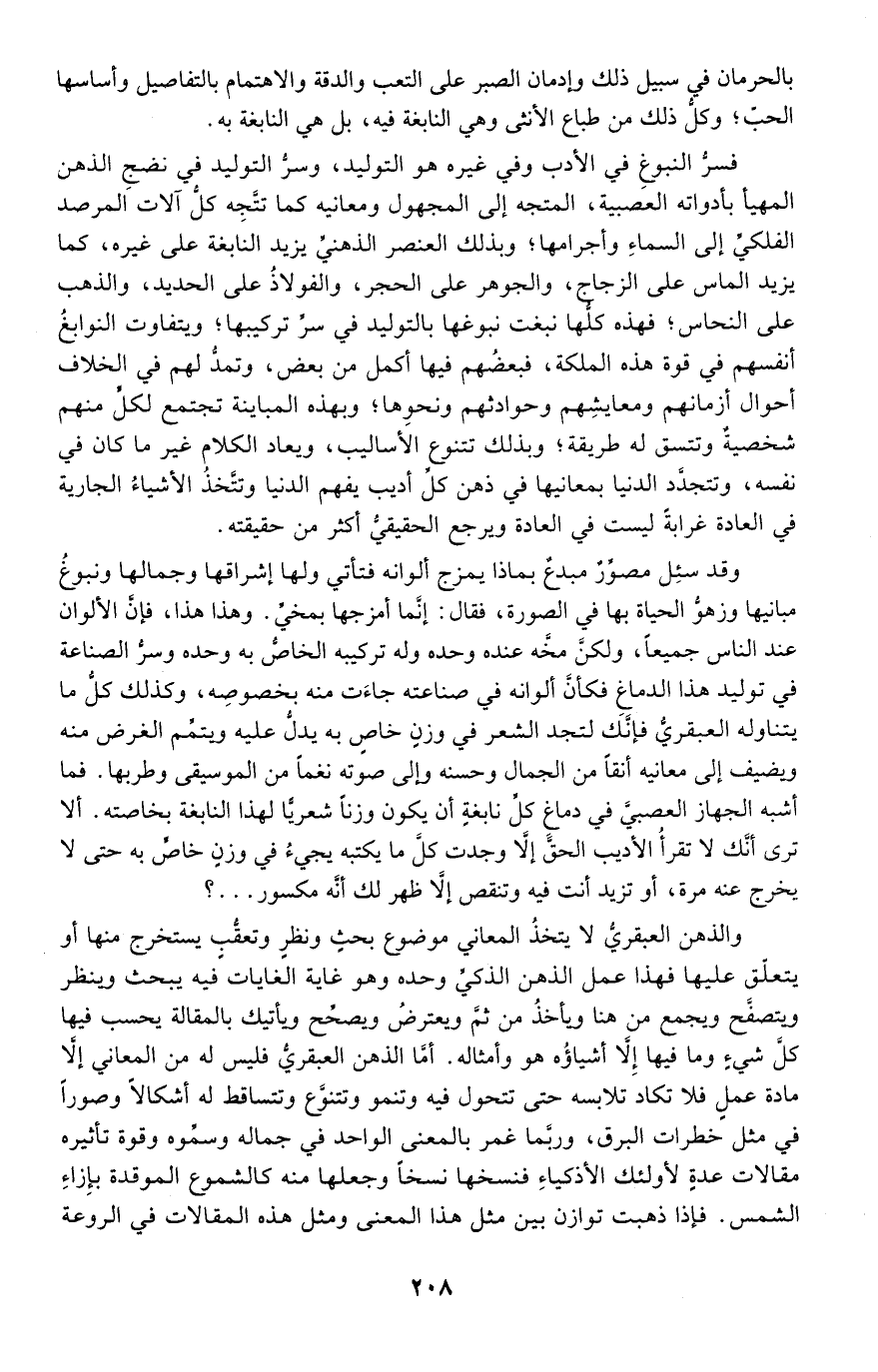 فسر النبوغ في الأدب وفي غيره هو التوليد، وسر التوليد في نضج الذهن المهيأ بأدواته العصبية، المتجه إلى المجهول ومعانيه كما تتجه كل آلات المرصد الفلكي إلى السماء وأجرامها؛ وبذلك العنصر الذهني يزيد النابغة على غيره، كما يزيد الماس على الزجاج، والجوهر على الحجر، والفولاذ على الحديد، والذهب على النحاس؛ فهذه كلها نبغت نبوغها بالتوليد في سر تركيبها؛ ويتفاوت النوابغ أنفسهم في قوة هذه الملكة، فبعضهم فيها أكمل من بعض، وتمد لهم في الخلاف أحوال أزمانهم ومعايشهم وحوادثهم ونحوها؛ وبهذه المباينة تجتمع لكل منهم شخصية وتتسق له طريقة؛ وبذلك تتنوع الأساليب، ويعاد الكلام غير ما كان في نفسه، وتتجدد الدنيا بمعانيها في ذهن كل أديب يفهم الدنيا وتتخذ الأشياء الجارية في العادة غرابة ليست في العادة ويرجع الحقيقي أكثر من حقيقته.