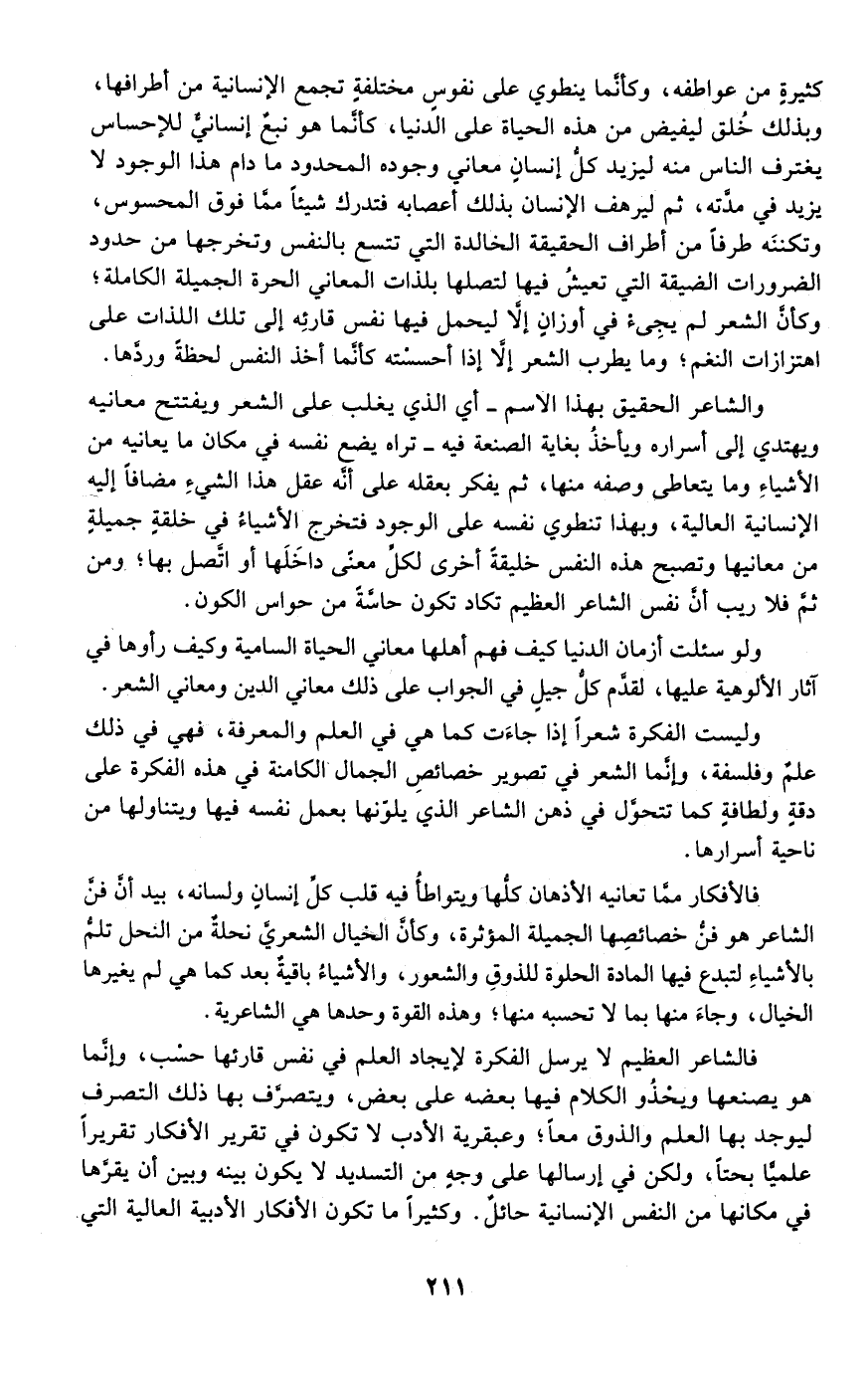 وليست الفكرة شعرًا إذا جاءت كما هي في العلم والمعرفة، فهي في ذلك علم وفلسفة، وإنما الشعر في تصوير خصائص الجمال الكامنة في هذه الفكرة على دقة ولطافة كما تتحول في ذهن الشاعر الذي يلونها بعمل نفسه فيها ويتناولها من ناحية أسرارها.