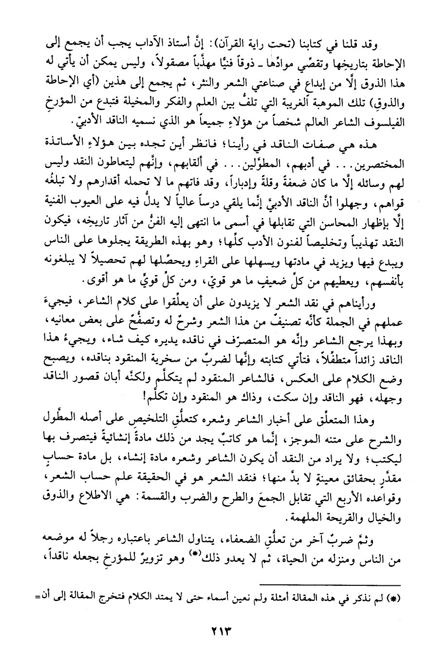 وقد قلنا في كتابنا "تحت راية القرآن": إن أستاذ الآداب يجب أن يجمع إلى الإحاطة بتاريخها وتقصي موادها ذوقًا فنيًا مهذبًا مصقولًا، وليس يمكن أن يأتي له هذا الذوق إلا من إيداع في صناعتي الشعر والنثر، ثم يجمع إلى هذين: "أي الإحاطة والذوق" تلك الموهبة الغريبة التي تلف بين العلم والفكر والمخيلة فتبدع من المؤرخ الفيلسوف الشاعر العالم شخصًا من هؤلاء جميعًا هو الذي نسميه الناقد الأدبي.