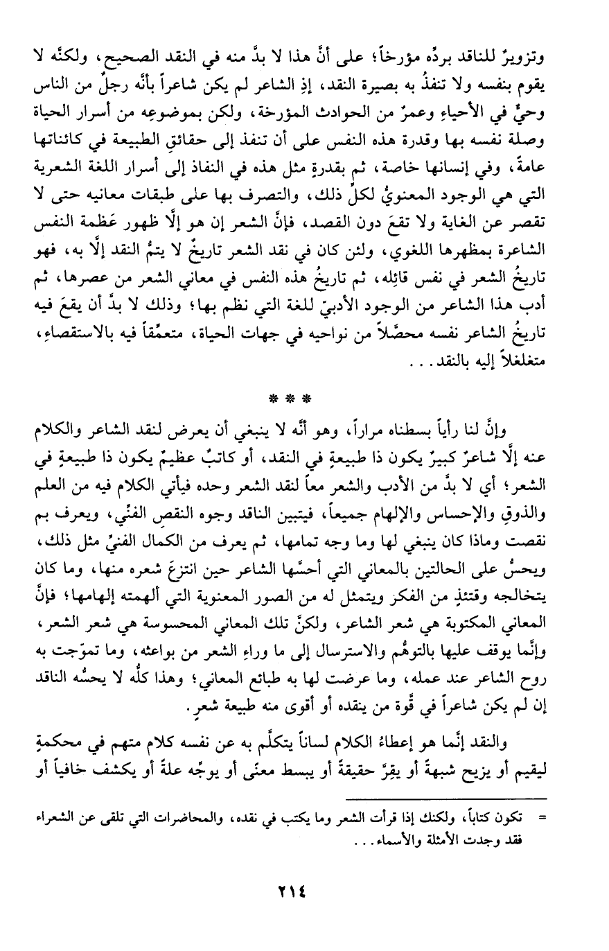 وإن لنا رأيًا بسطناه مرارًا، وهو أنه لا ينبغي أن يعرض لنقد الشاعر والكلام عنه إلا شاعر كبير يكون ذا طبيعة في النقد، أو كاتب عظيم يكون ذا طبيعة في الشعر؛ أي لا بد من الأدب والشعر معًا لنقد الشعر وحده فيأتي الكلام فيه من العلم والذوق والإحساس والإلهام جميعًا، فيتبين الناقد وجوه النقص الفني، ويعرف بما نقصت وماذا كان ينبغي لها وما وجه تمامها، ثم يعرف من الكمال الفني مثل ذلك، ويحس على الحالتين بالمعاني التي أحسها الشاعر حين انتزع شعره منها، وما كان يتخالجه وقتئذ من الفكر ويتمثل له من الصور المعنوية التي ألهمته إلهامها؛ فإن المعاني المكتوبة هي شعر الشاعر، ولكن تلك المعاني المحسوسة هي شعر الشعر، وإنما يوقف عليها بالتوهم والاسترسال إلى ما وراء الطبيعة من بواعثه، وما تموجت به روح الشاعر عند عمله، وما عرضت لها به طبائع المعاني؛ وهذا كله لا يحسه الناقد إن لم يكن شاعرًا في قوة ما ينقده أو أقوى منه طبيعة شعر.