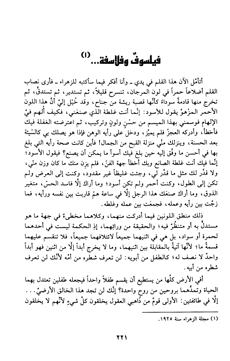 أتأمل الآن هذا القلم في يدي -وأنا أفكر فيما سأكتبه للزهراء- فأرى نصاب القلم أضلاعًا حمرًا في لون المرجان، تنسرح قليلًا، ثم تستدير، ثم تستدق، ثم تخرج منها قادمة سوداء كأنها قصبة ريشة من جناح، وقد خيل إلي أن هذا اللون الأحمر المزهو يقول للأسود: إنما أنت غلطة الذي صنعني، فكيف ألهم في الإلهام فوسمني بهذا الميسم من حسن ولون وتركيب، ثم اعترضته الغفلة فيك فأخطأ، وأدركه العجز فلم يميز، ودخل على رأيه الوهن فإذا هو يصلك بي كالسيئة بعد الحسنة، وينزلك مني منزلة القبح من الجمال! فأين كانت صحة رأيه التي بلغ بها في أحسن ما وفق إليه حين بلغ فيك أسوأ ما يمكن أن يصنع؟ فيقول الأسود؛ إنما فيك أنت غلطة الصانع وبك أخطأ جهة الفن، فلم يزن منك ما كان وزن مني، ولا قدر لك مثل ما قد لي، وجئت غليظًا غير مقدود، وكنت إلى العرض ولم تكن إلى الطول، وكنت أحمر ولم تكن أسود؛ وما أراك إلا فاسد الحس، متغير الذوق، وما أراك صنعك هذا الرجل إلا في ساعة هم قاربت بين نفسه ورأيه، فما زجت بين رأيه وعمله، فجمعت بين عمله وغلطه.