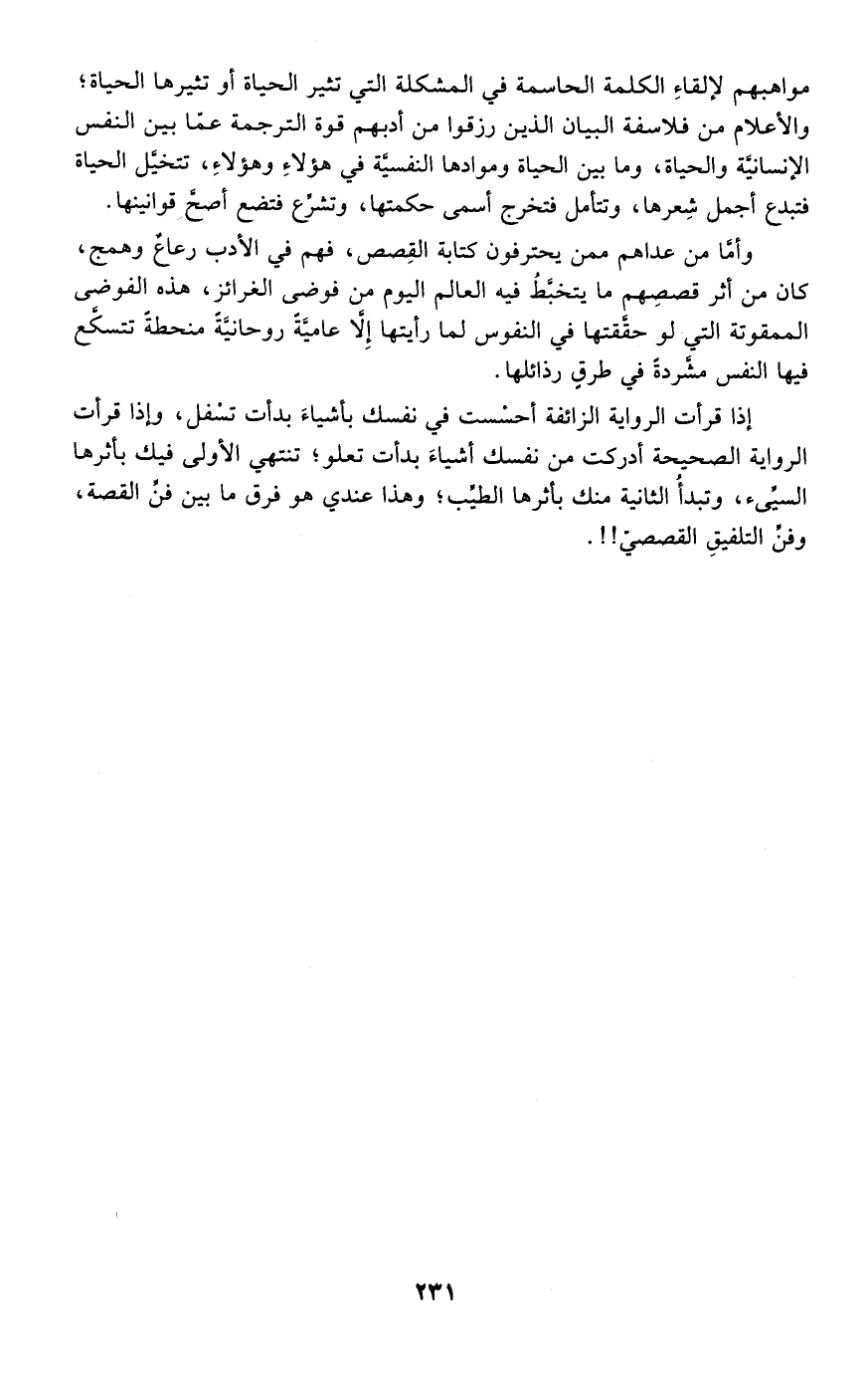 إذا قرأت الرواية الزائفة أحسست في نفسك بأشياء بدأت تسفل، وإذا قرأت الرواية الصحيحة أدركت من نفسك أشياء بدأت تعلو، تنتهي الأولى فيك بأثرها السيئ، وتبدأ الثانية منك بأثرها الطيب؛ وهذا عندي هو فوق ما بين فن القصة وفن التلفيق القصصي!!.