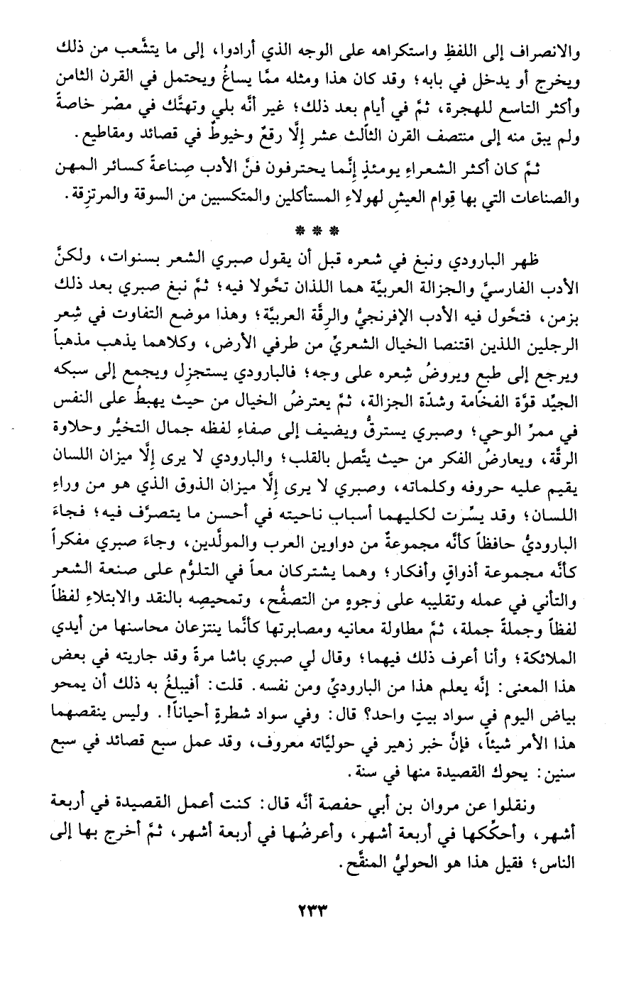 ظهر البارودي ونبغ في شعره قبل أن يقول صبري الشعر بسنوات، ولكن الأدب الفارسي والجزالة العربية هما اللذان تحولا فيه؛ ثم نبغ صبري بعد ذلك بزمن، فتحول فيه الأدب الإفرنجي والرقة العربية؛ وهذا موضع التفاوت في شعر الرجلين اللذين اقتنصا الخيال الشعري من طرفي الأرض، وكلاهما يذهب مذهبًا ويرجع إلى طبع ويروض شعره على وجه؛ فالبارودي يستجزل ويجمع إلى سبكه الجيد قوة الفخامة وشدة الجزالة، ثم يعترض الخيال من حيث يهبط على النفس في ممر الوحي؛ وصبري يسترق ويضيف إلى صفاء لفظه جمال التخير وحلاوة الرقة، ويعارض الفكر من حيث يتصل بالقلب؛ والبارودي لا يرى إلا ميزان اللسان يقيم عليه حروفه وكلماته، وصبري لا يرى إلا ميزان الذوق الذي هو من وراء اللسان؛ وقد يسرت لكليهما أسباب ناحيته في أحسن ما يتصرف فيه؛ فجاء البارودي حافظًا كأنه مجموعة من دواوين العرب والمولدين، وجاء صبري مفكرًا كأنه مجموعة أذواق وأفكار؛ وهما يشتركان معًا في التلوم على صنعة الشعر والتأني في عمله وتقليبه على وجوه من التصفح، وتمحيصه بالنقد والابتلاء لفظًا لفظًا وجملة جملة، ثم مطاولة معانيه ومصابرتها كأنما ينتزعان محاسنها من أيدي الملائكة؛ وأنا أعرف ذلك فيهما؛ وقال لي صبري باشا مرة وقد جاريته في بعض هذا المعنى: إنه يعلم هذا من البارودي ومن نفسه. قلت: أفيبلغ به ذلك أن يمحو بياض اليوم في سواد بيت واحد؟ قال: وفي سواد شطرة أحيانًا! وليس ينقصهما هذا الأمر شيئًا، فإن خبر زهير في حولياته معروف، وقد عمل سبع قصائد في سبع ستين: يحوك القصيدة منها في سنة.