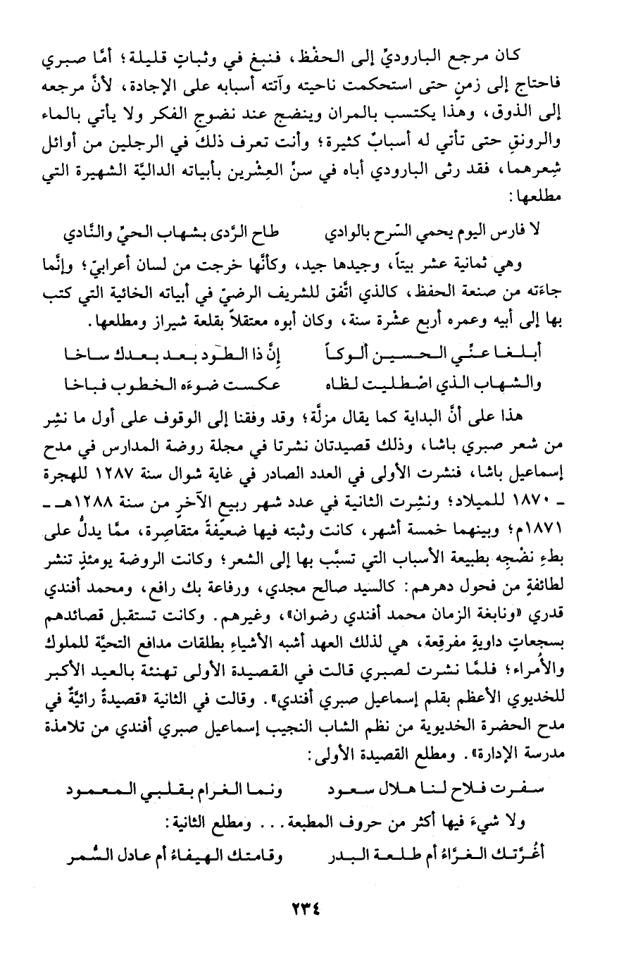 كان مرجع البارودي إلى الحفظ، فنبغ في وثبات قليلة؛ أما صبري فاحتاج إلى زمن حتى استحكمت ناحيته وآتته أسبابه على الإجادة، لأن مرجعه إلى الذوق، وهذا يكتسب بالمران وينضج عند نضوج الفكر ولا يأتي بالماء والرونق حتى تأتي له أسباب كثيرة؛ وأنت تعرف ذلك في الرجلين من أوائل شعرهما، فقد رثى البارودي أباه في سن العشرين بأبياته الدالية الشهيرة التي مطلعها: