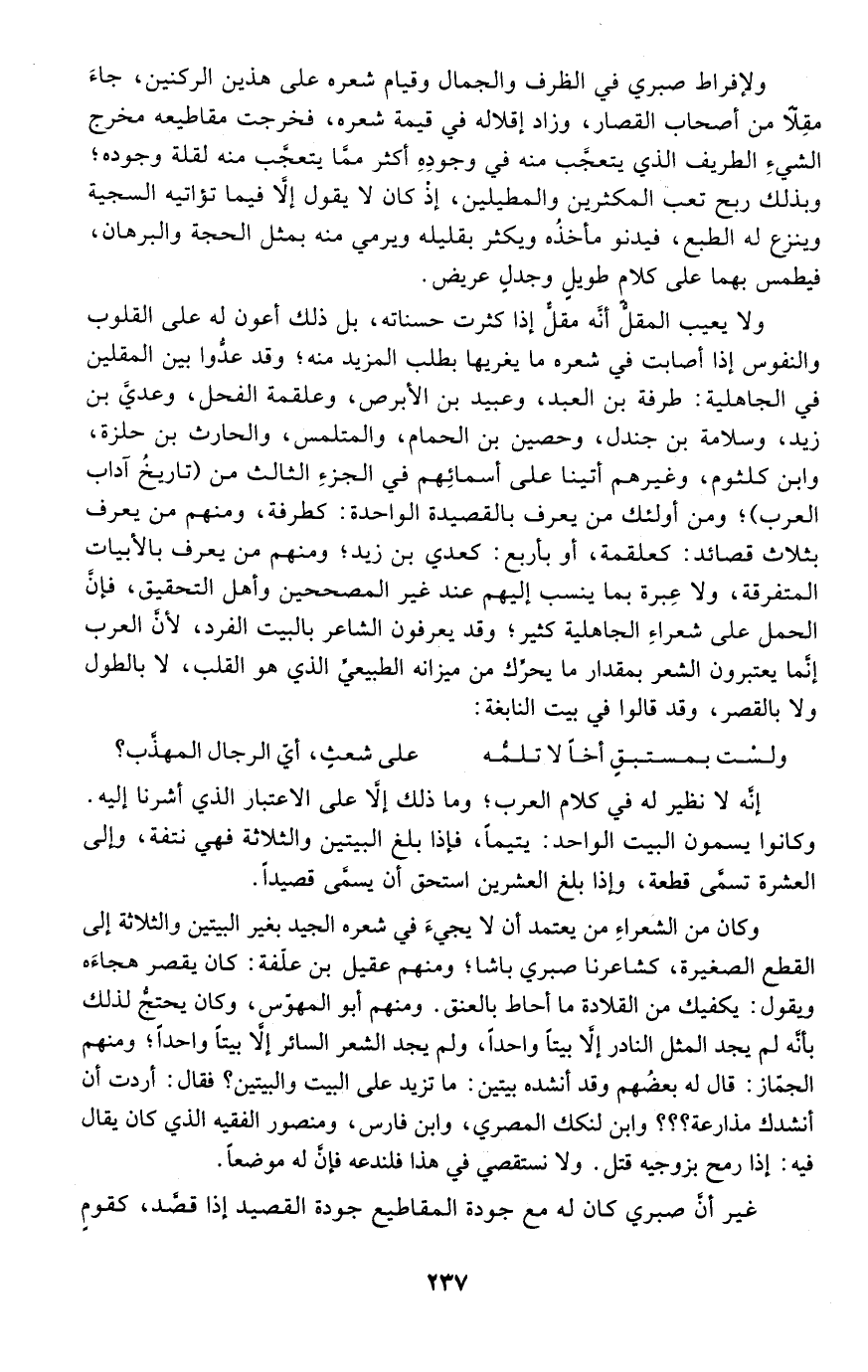 وكان من الشعراء من يعتمد أن لا يجيء في شعره الجيد بغير البيتين والثلاثة إلى القطع الصغيرة، كشاعرنا صبري باشا؛ ومنهم عقيل بن علقمة: كان يقصر هجاءه ويقول: يكفيك من القلادة ما أحاط بالعنق. ومنهم أبو المهوس، وكان يحتج لذلك بأنه لم يجد المثل النادر إلا بيتًا واحدًا، ولم يجد الشعر السائر إلا بيتًا واحدًا؛ ومنهم الجماز: قال له بعضهم وقد أنشده بيتين: ما تزيد على البيت والبيتين؟ فقال: أردت أن أنشدك مذارعة؟؟ وابن لنكك المصري، وابن فارس، ومنصور الفقيه الذي كان يقال فيه: إذا رمح بزوجيه قتل. ولا نستقصي في هذا فلندعه فإن له موضعًا.