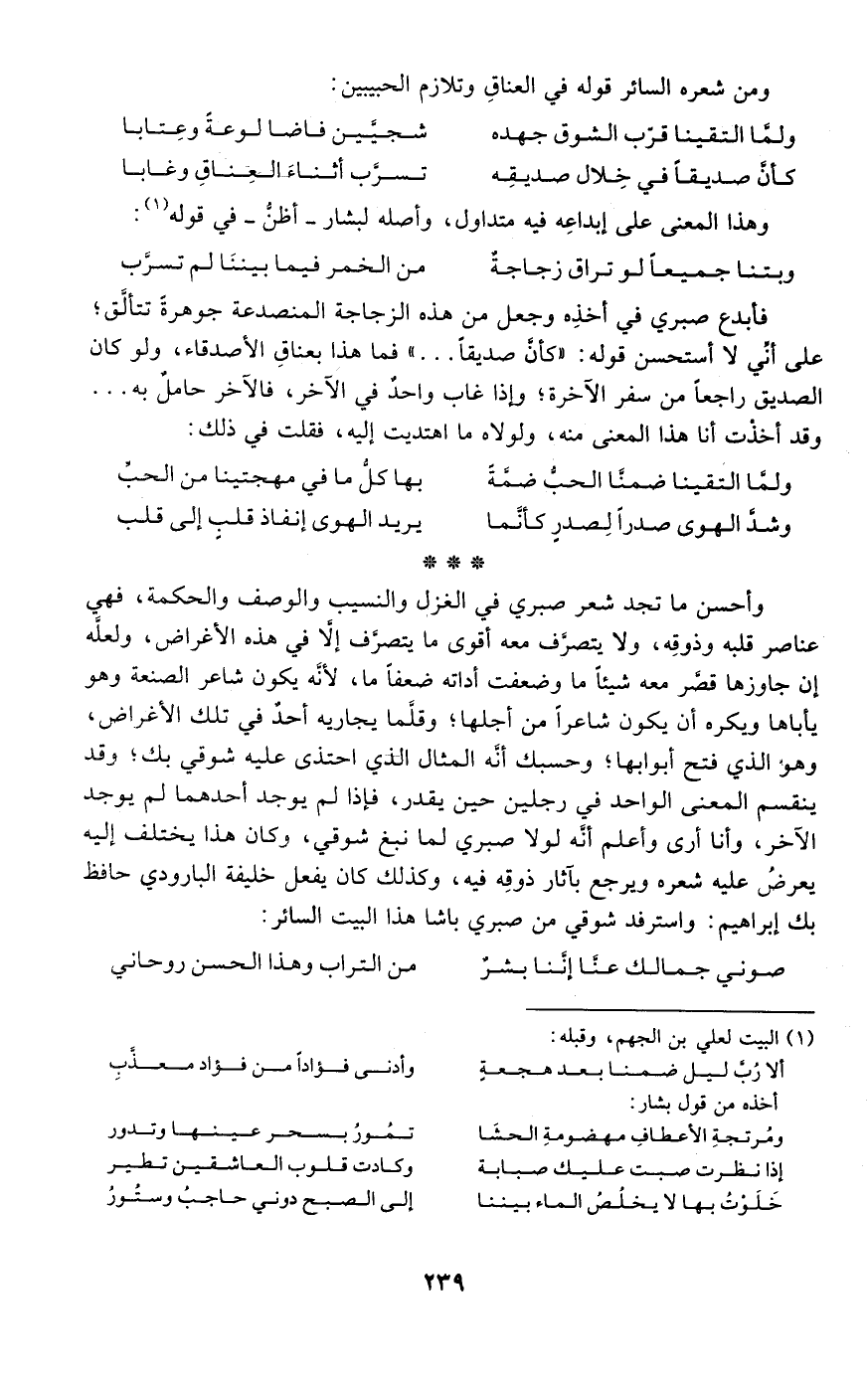 فأبدع صبري في أخذه وجعل من هذه الزجاجة المنصدعة جوهرة تتألق؛ على أني لا أستحسن قوله: "كأن صديقًا ... " فما هذا بعناق الأصدقاء، ولو كان الصديق راجعًا من سفر الآخرة؛ وإذا غاب واحد في الآخر، فالآخر حامل به ... وقد أخذت أنا هذا المعنى منه، ولولاه ما اهتديت إليه، فقلت في ذلك: