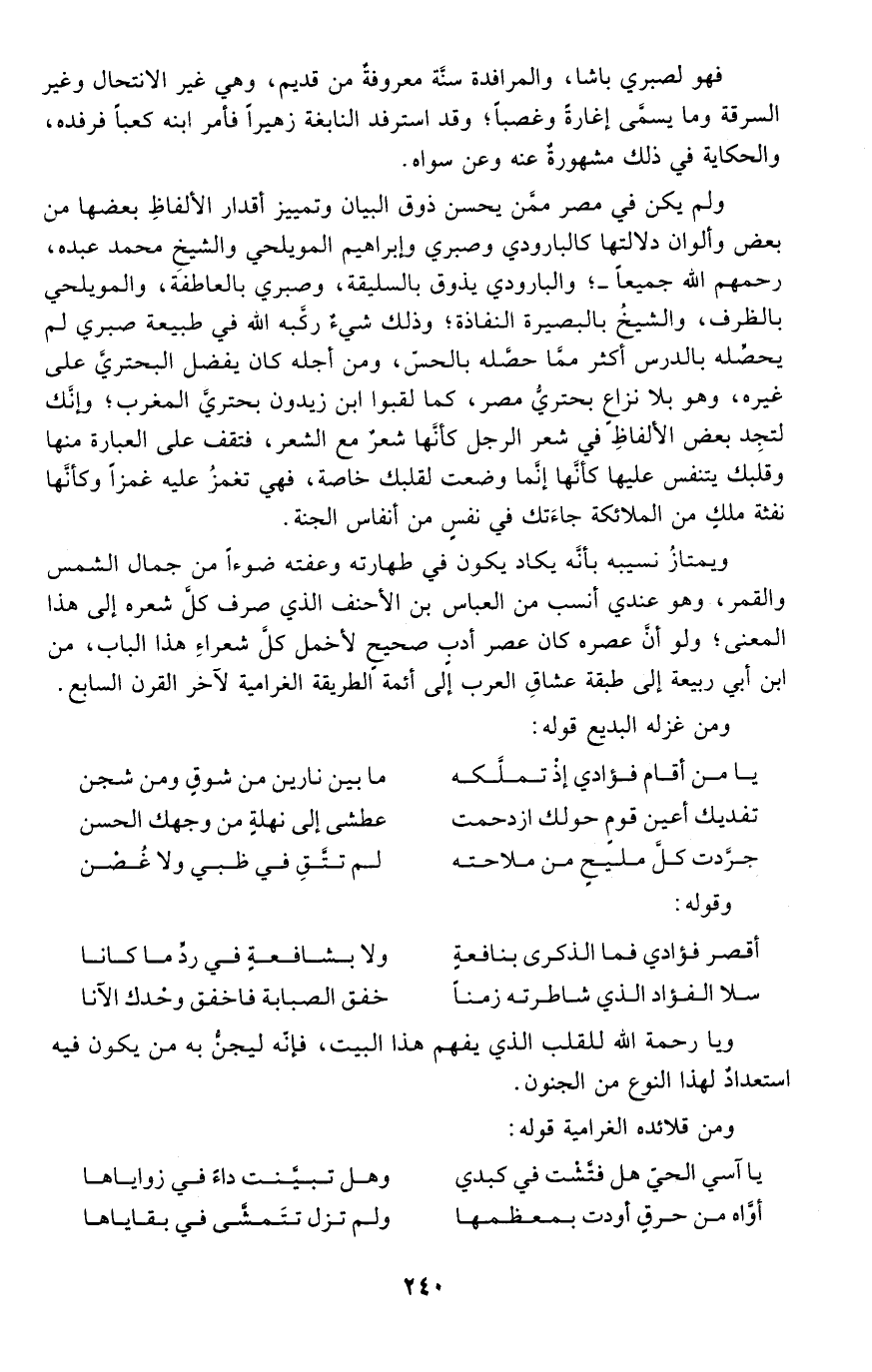 ويمتاز نسيبه بأنه يكاد يكون في طهارته وعفته ضوءًا من جمال الشمس والقمر، وهو عندي أنسب من العباس بن الأحنف الذي صرف كل شعره إلى هذا المعنى؛ ولو أن عصره كان عصر أدب صحيح لأخمل كل شعراء هذا الباب، من ابن أبي ربيعة إلى طبقة عشاق العرب إلى أئمة الطريقة الغرامية لآخر القرن السابع.