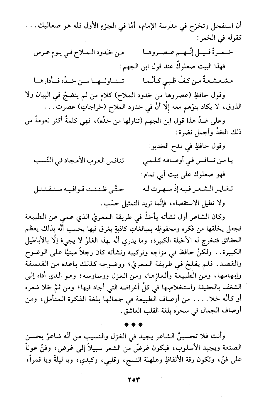 وأنت فلا تحسبن الشاعر يجيد في الغزل والنسيب من أنه شاعر يحسن الصنعة ويجيد الأسلوب، فيكون غرض من الشعر سبيلًا إلى غرض، وفن عونًا على فن، وتكون رقة الألفاظ وهلهلة النسج، وقلبي، وكبدي، ويا ليلة ويا قمرًا،
