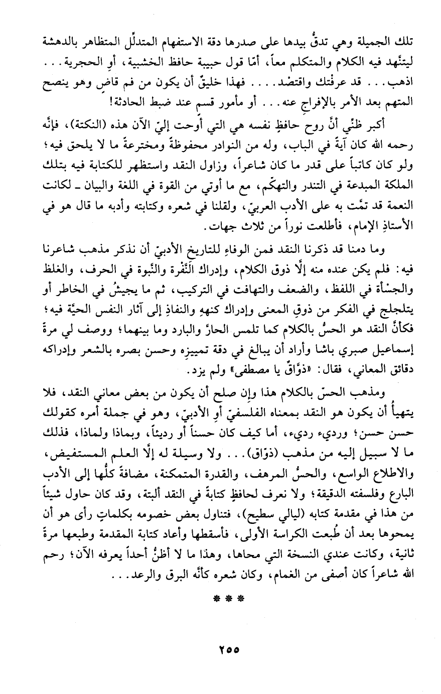 ومذهب الحس بالكلام هذا وإن صلح أن يكون من بعض معاني النقد، فلا يتهيأ أن يكون هو النقد بمعناه الفلسفي أو الأدبي، وهو في جملة أمره كقولك حسن حسن؛ وردي رديء، أما كيف كان حسنًا أو رديئًا، وبماذا ولماذا، فذلك ما لا سبيل إليه من مذهب "ذواق" ... ولا وسيلة له إلا العلم المستفيض، والاطلاع الواسع، والحس المرهف، والقدرة المتمكنة، مضافة كلها إلى الأدب البارع وفلسفته الدقيقة؛ ولا نعرف لحافظ كتابة في النقد البتة، وقد كان حاول شيئًا من هذا في مقدمة كتابه "ليالي سطيح"، فتناول بعض خصومه بكلمات رأى هو أن يمحوها بعد أن طبعت الكراسة الأولى، فأسقطها وأعاد كتابة المقدمة وطبعها مرة ثانية، وكانت عندي النسخة التي محاها، وهذا ما لا أظن أحدًا يعرفه الآن؛ رحم الله شاعرًا كان أصفى من الغمام، وكان شعره كأنه البرق والرعد ...