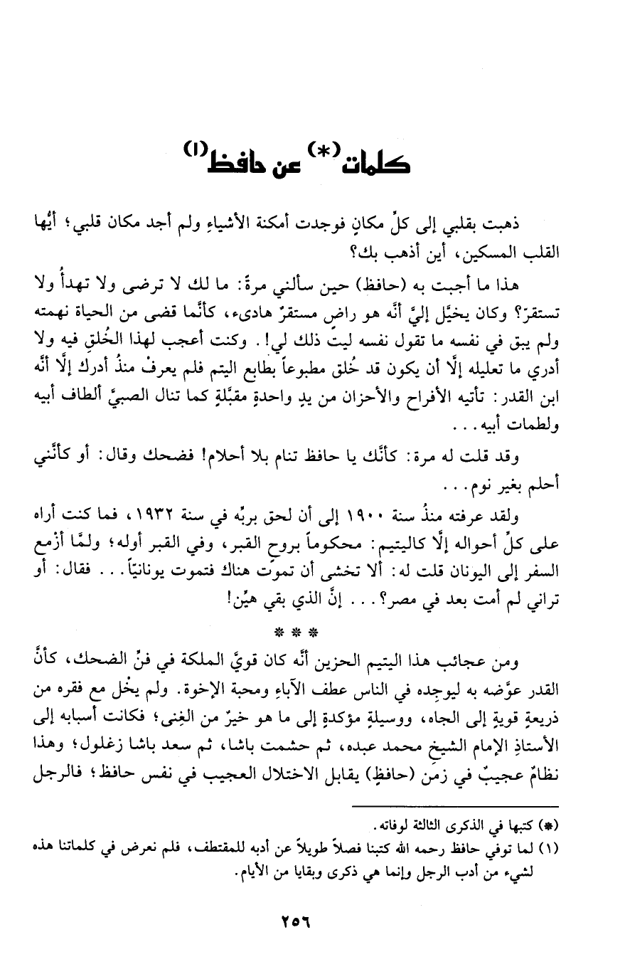 هذا ما أجبت به "حافظ" حين سألني مرة: ما لك لا ترضى ولا تهدأ ولا تستقر؟ وكان يخيل إلي أنه هو راضٍ مستقر هادئ، كأنما قضى من الحياة نهمته ولم يبق في نفسه ما تقول نفسه ليست ذلك لي!. وكنت أعجب لهذا الخلق فيه ولا أدري ما تعليله إلا أن يكون قد خلق مطبوعًا بطابع اليتم فلم يعرف منذ أدرك إلا أنه ابن القدر؛ تأتيه الأفراح والأحزان من يد واحدة مقبلة كما تنال الصبي ألطاف أبيه ولطمات أبيه ...