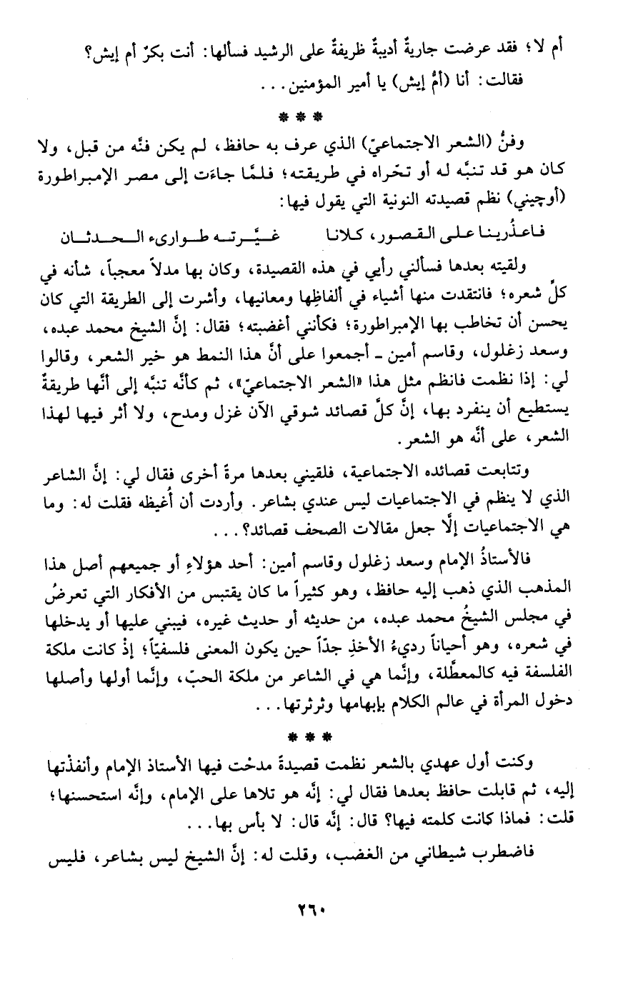 ولقيته بعدها فسألني رأيي في هذه القصيدة، وكان بها مدلًا معجبًا، شأنه في كل شعره؛ فانتقدت منها أشياء في ألفاظها ومعانيها، وأشرت إلى الطريقة التي كان يحسن أن تخاطب بها الإمبراطورة؛ فكأنني أغضبته؛ فقال: إن الشيخ محمد عبده، وسعد زغلول، وقاسم أمين -أجمعوا على أن هذا النمط هو خير الشعر، وقالوا لي: إذا نظمت فانظم مثل هذا "الشعر الاجتماعي"، ثم كأنه تنبه إلى أنها طريقة يستطيع أن ينفرد بها، إن كل قصائد شوقي الآن غزل ومدح، ولا أثر فيها لهذا الشعر، على أنه هو الشعر.