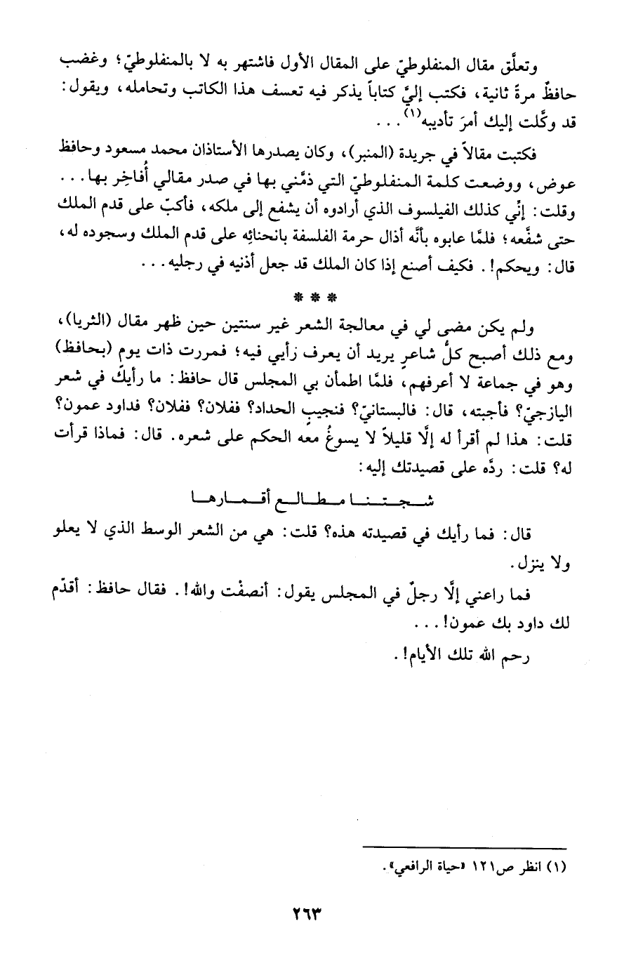 ولم يكن مضى لي في معالجة الشعر غير سنتين حين ظهر مقال "الثريا"، ومع ذلك أصبح كل شاعر يريد أن يعرف رأيي فيه؛ فمررت ذات يوم "بحافظ" وهو في جماعة لا أعرفهم، فلما اطمأن بي المجلس قال حافظ: ما رأيك في شعر اليازجي؟ فأجبته: قال: فالبستاني؟ فنجيب الحداد؟ ففلان؟ ففلان؟ فداود عمون؟ قلت: هذا لم أقرأ له إلا قليلًا لا يسوغ معه الحكم على شعره. قال: فماذا قرأت له؟ قلت: رده على قصيدتك إليه: