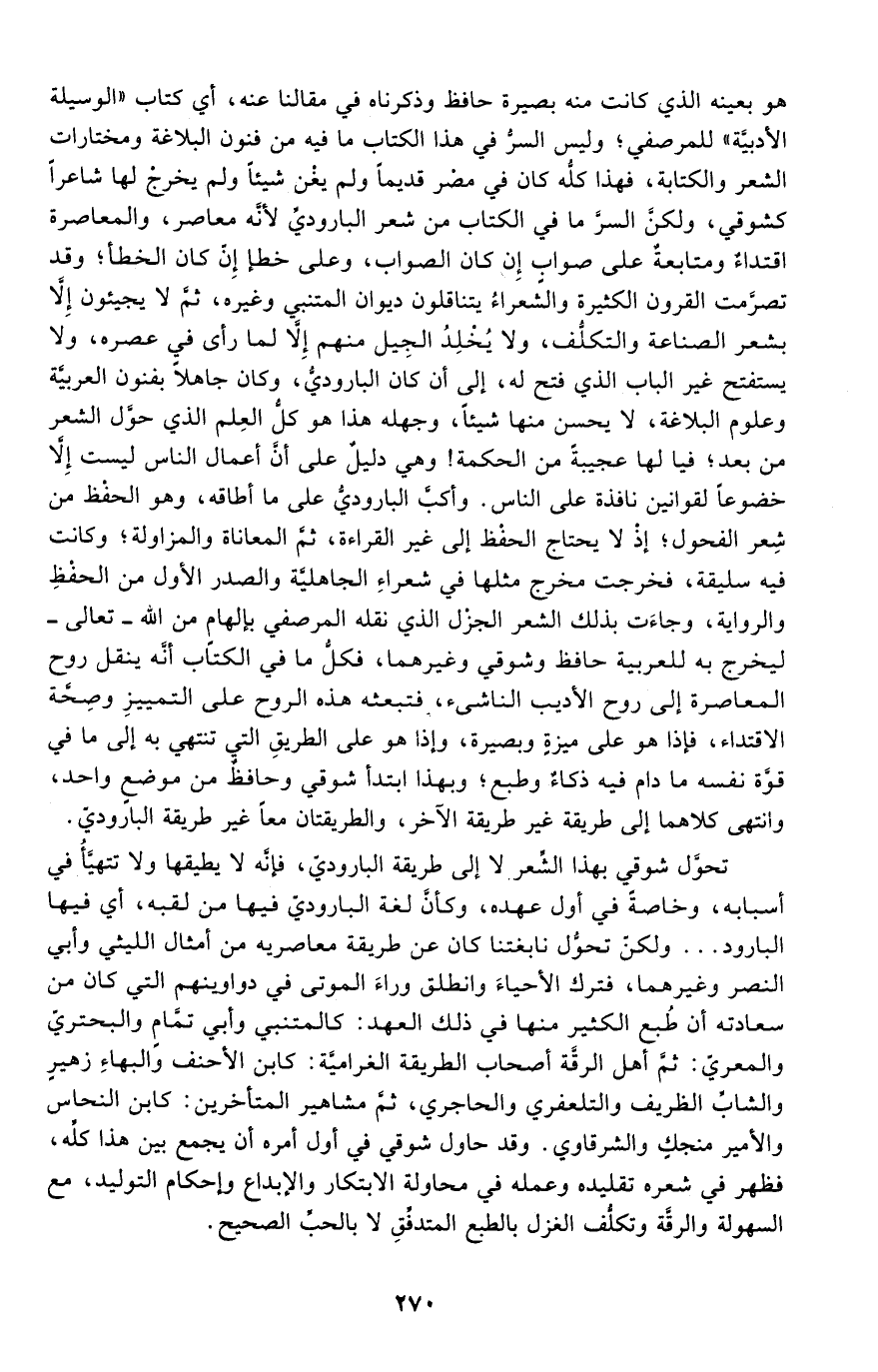 هو بعينه الذي كانت منه بصيرة حافظ وذكرناه في مقالنا عنه، أي كتاب "الوسيلة الأدبية" للمرصفي؛ وليس السر في هذا الكتاب ما فيه من فنون البلاغة ومختارات الشعر والكتابة، فهذا كله كان في مصر قديمًا ولم يغنِ شيئًا ولم يخرج لها شاعرًا كشوقي، ولكن السر ما في الكتاب من شعر البارودي؛ لأنه معاصر، والمعاصرة اقتداء ومتابعة على صواب إن كان الصواب، وعلى خطأ إن كان الخطأ؛ وقد تصرمت القرون الكثيرة والشعراء يتناقلون ديوان المتنبي وغيره، ثم لا يجيئون إلا بشعر الصناعة والتكلف، ولا يخلد الجيل منهم إلا لما رأى في عصره، ولا يستفتح غير الباب الذي فتح له، إلى أن كان البارودي، وكان جاهلًا بفنون العربية وعلوم البلاغة، لا يحسن منها شئًا، وجهله هذا هو كل العالم الذي حول الشعر من بعد؛ فيا لها عجيبة من الحكمة! وهي دليل على أن أعمال الناس ليست إلا خضوعًا لقوانين نافذة على الناس. وأكب البارودي على ما أطاقه، وهو الحفظ من شعر الفحول؛ إذ لا يحتاج الحفظ إلى غير القراءة، ثم المعاناة والمزاولة؛ وكانت فيه سليقة، فخرجت مخرج مثلها في شعراء الجاهلية والصدر الأول من الحفظ والرواية، وجاءت بذلك الشعر الجزل الذي نقله المرصفي بإلهام من الله -تعالى- ليخرج به للعربية حافظ وشوقي وغيرهما، فكل ما في الكتاب أنه ينقل روح المعاصرة إلى روح الأديب الناشئ، فتبعثه هذه الروح على التمييز وصحة الاقتداء، فإذا هو على ميزة وبصيرة، وإذا هو على الطريق التي تنتهي به إلى ما في قوة نفسه ما دام فيه ذكاء وطبع؛ وبهذا ابتدأ شوقي وحافظ من موضع واحد، وانتهى كلاهما إلى طريقة غير طريقة الآخر، والطريقتان معًا غير طريقة البارودي.