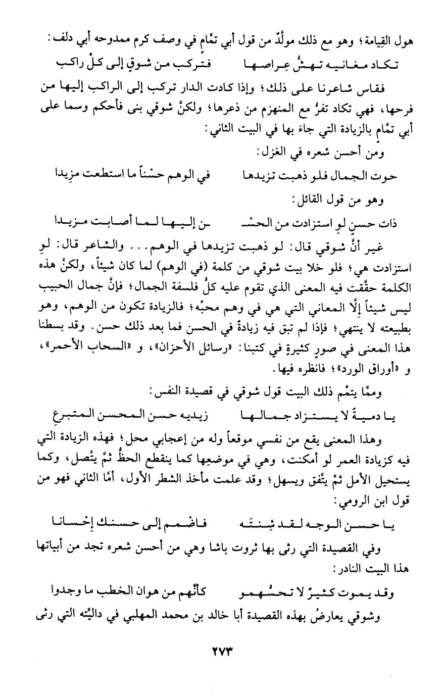 غير أن شوقي قال: لو ذهبت تزيدها في الوهم ... والشاعر قال: لو استزادت هي؛ فلو خلا بيت شوقي من كلمة "في الوهم" لما كان شيئًا، ولكن هذه الكلمة حققت فيه المعنى الذي تقوم عليه كل فلسفة الجمال؛ فإن جمال الحبيب ليس شيئًا إلا المعاني التي هي في وهم محبه؛ فالزيادة تكون من الوهم، وهو بطبيعته لا ينتهي؛ فإذا لم تبق فيه زيادة في الحسن فما بعد ذلك حسن، وقد بسطنا هذا المعنى في صور كثيرة في كتبنا: "رسائل الأحزان" و "السحاب الأحمر"، و "أوراق الورد"؛ فانظر فيها.