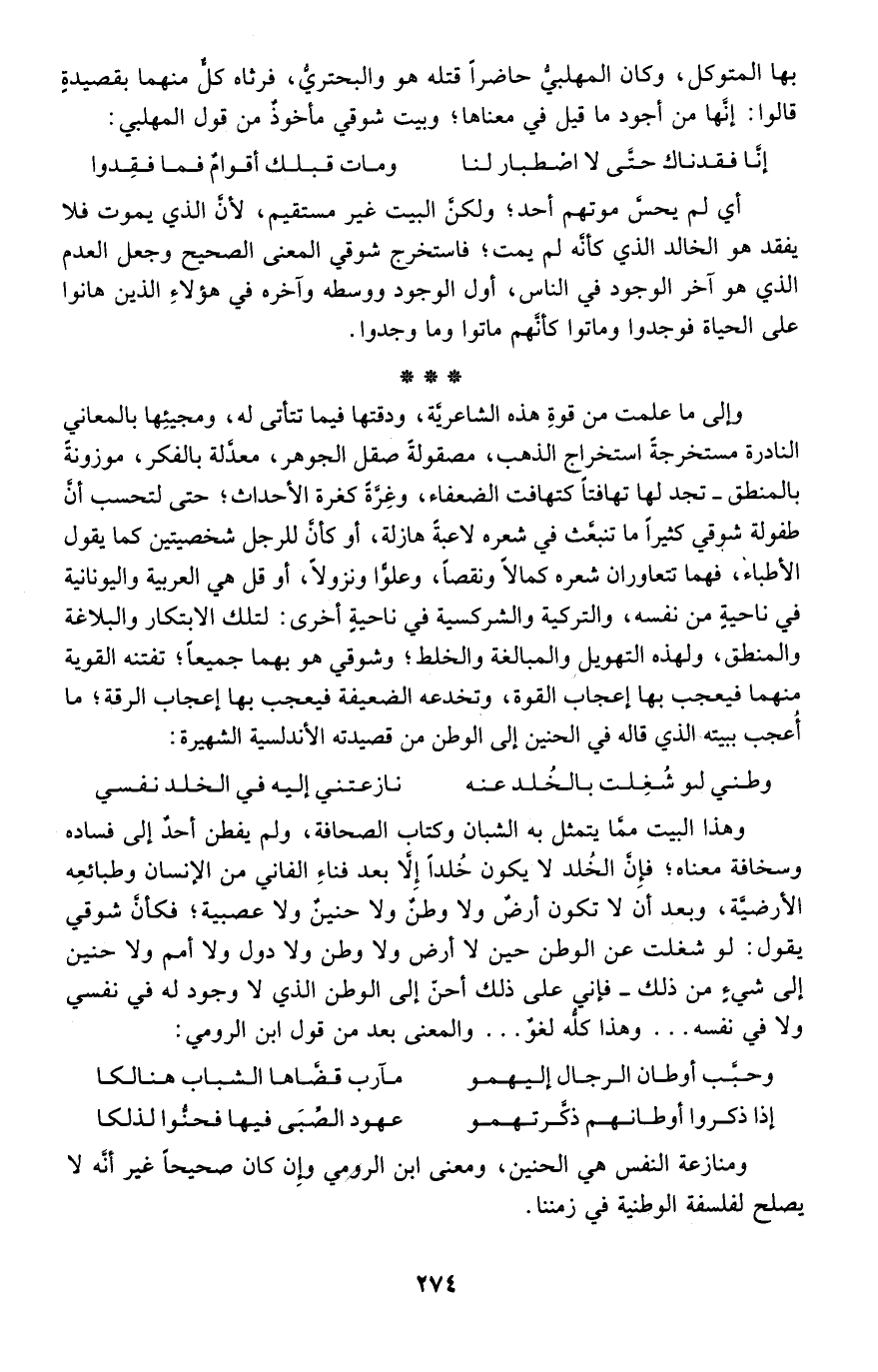 وهذا البيت مما يتمثل به الشبان وكتاب الصحافة، ولم يفطن أحد إلى فساده وسخافة معناه؛ فإن الخلد لا يكون خلدًا إلا بعد فناء الفاني من الإنسان وطبائعه الأرضية، وبعد أن لا تكون أرض ولا وطن ولا حنين ولا عصبية؛ فكان شوقي يقول: لو شغلت عن الوطن حين لا أرض ولا وطن ولا دول ولا أمم ولا حنين إلى شيء من ذلك- فإني على ذلك أحن إلى الوطن الذي لا وجود له في نفسي ولا في نفسه.... وهذا كله لغو ... والمعنى بعد من قول ابن الرومي: