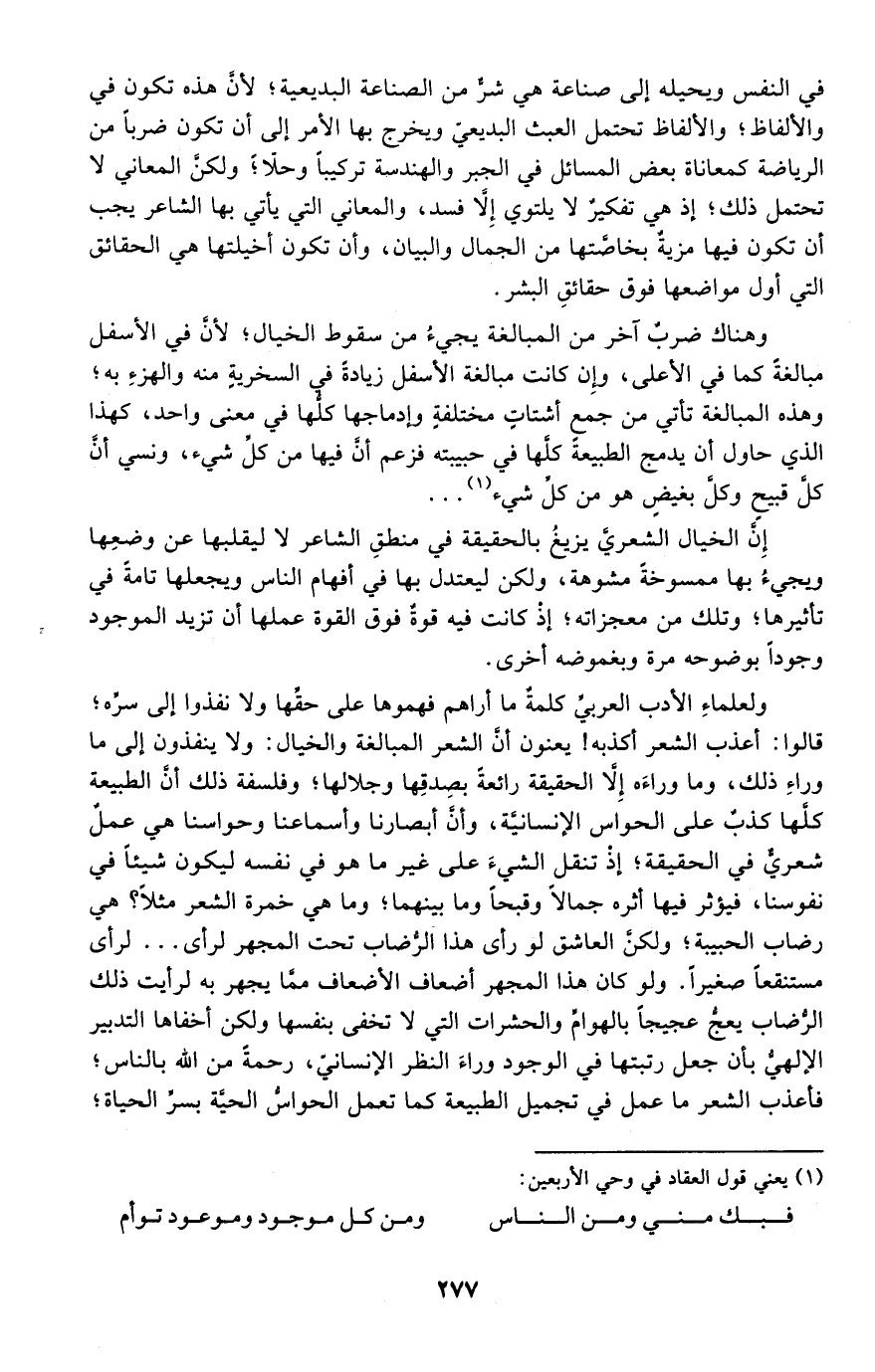 في النفس ويحيله إلى صناعة هي شر من الصناعة البديعية؛ لأن هذه تكون في والألفاظ؛ والألفاظ تحتمل العبث البديعي ويخرج بها الأمر إلى أن يكون ضربًا من الرياضة كمعاناة بعض المسائل في الجبر والهندسة تركيبًا وحلًا؛ ولكن المعاني لا تحتمل ذلك؛ إذ هي تفكير لا يلتوي إلا فسد، والمعاني التي يأتي بها الشاعر يجب أن تكون فيها مزية بخاصتها من الجمال والبيان، وأن تكون أخيلتها هي الحقائق التي أول مواضعها فوق حقائق البشر.