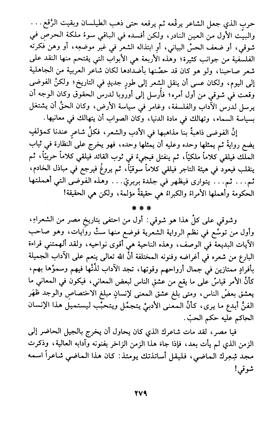 وشوقي على كل هذا هو شوقي: أول من احتفى بتاريخ مصر من الشعراء، وأول من توسع في نظم الرواية الشعرية فوضع منها ست روايات، وهو صاحب الآيات البديعة في الوصف، وهذه الناحية هي أقوى نواحيه، ولقد ألهمتني قراءة البارع من شعره في أغراضه وفنونه المختلفة أن الله تعالى ينعم على الآداب الجميلة بأفراد ممتازين في جمال أرواحهم وقوتها، تجد الآداب لذتها فيهم وسموها بهم، كأن الأمر قياس على ما يقع من عشق الناس لبعض المعاني، فيكون في المعاني ما يعشق بعض الناس، ومتى بلغ عشق المعنى لإنسان مبلغ الاختصاص والوجد ظهر الفن أبدع ما يرى، كأن المعنى الأدبي يتجمل ويتحبب ليستميل هذا الإنسان الحاكم عليه حكم الحب.