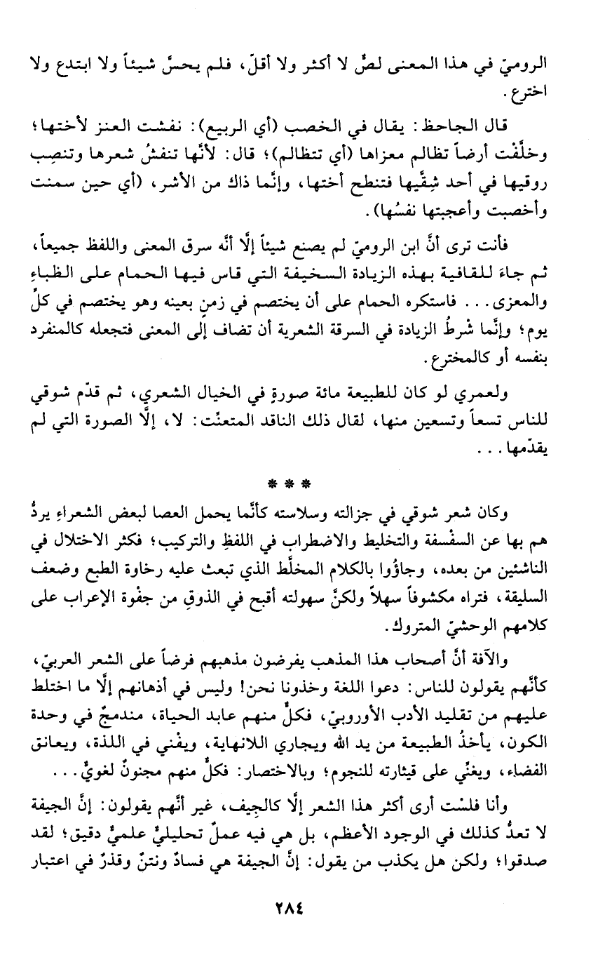 والآفة أن أصحاب هذا المذهب يفرضون مذهبهم فرضًا على الشعر العربي، كأنهم يقولون للناس: دعوا اللغة وخذونا نحن! وليس في أذهانهم إلا ما اختلط عليهم من تقليد الأدب الأوروبي، فكل منهم عابد الحياة، مندمج في وحدة الكون، يأخذ الطبيعة من يد الله ويجاري اللانهاية، ويفنى في اللذة، ويعانق الفضاء، ويغني على قيثارته للنجوم؛ وبالاختصار: فكل منهم مجنون لغوي..