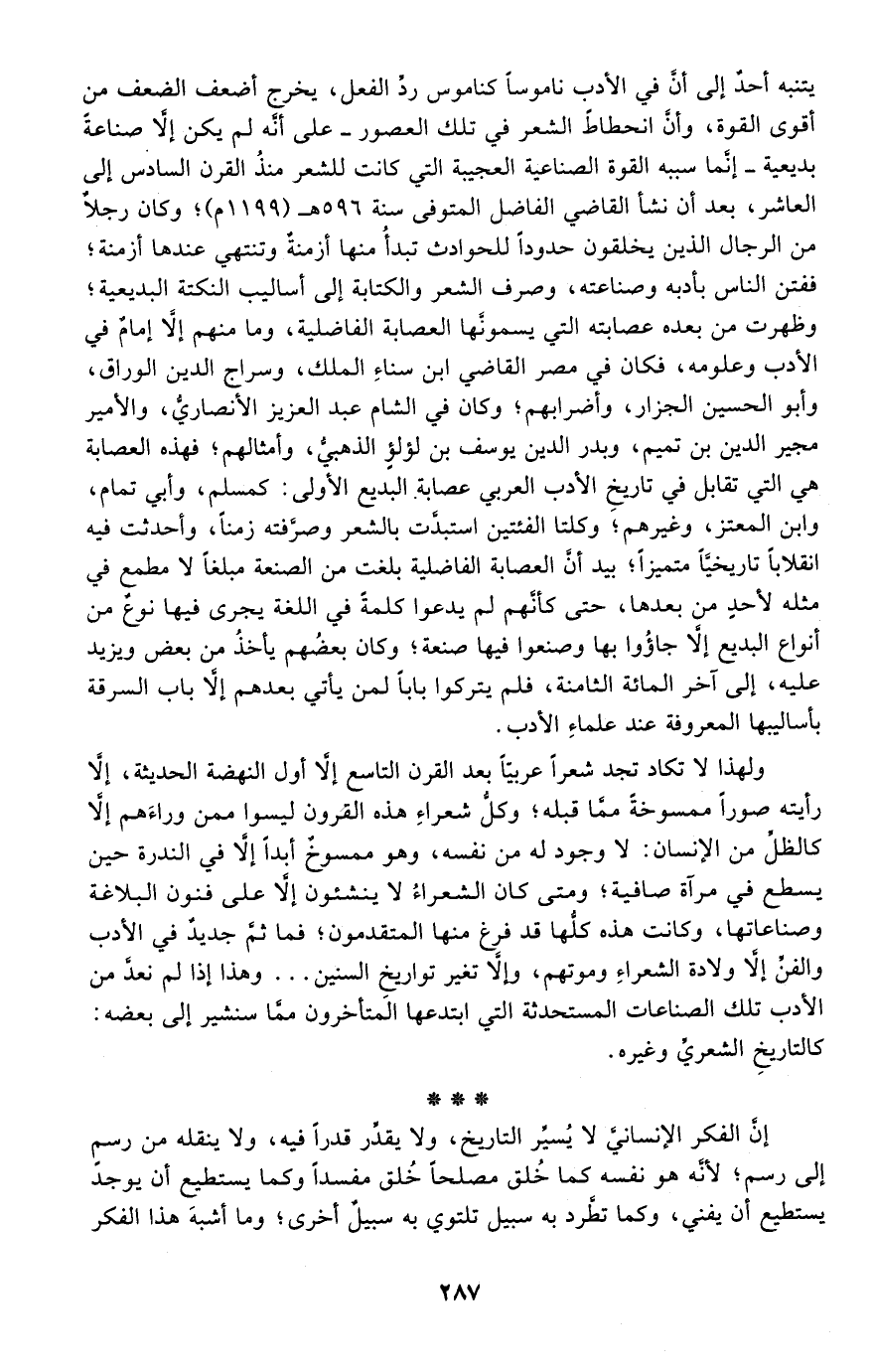 ولهذا لا تكاد تجد شعرًا عربيًّا بعد القرن التاسع إلا أول النهضة الحديثة، إلا رأيته صورًا ممسوخة مما قبله؛ وكل شعراء هذه القرون ليسوا ممن وراءهم إلا كالظل من الإنسان: لا وجود له من نفسه، وهو ممسوخ أبدًا إلا في الندرة حين يسطع في مرآة صافية؛ ومتى كان الشعراء لا ينشئون إلا على فنون البلاغة وصناعاتها، وكانت هذه كلها قد فرغ منها المتقدمون؛ فما ثم جديد في الأدب والفن إلا ولادة الشعراء وموتهم، وإلا تغير تواريخ السنين.. وهذا إذا لم نعد من الأدب تلك الصناعات المستحدثة التي ابتدعها المتأخرون مما سنشير إلى بعضه: كالتاريخ الشعري وغيره.