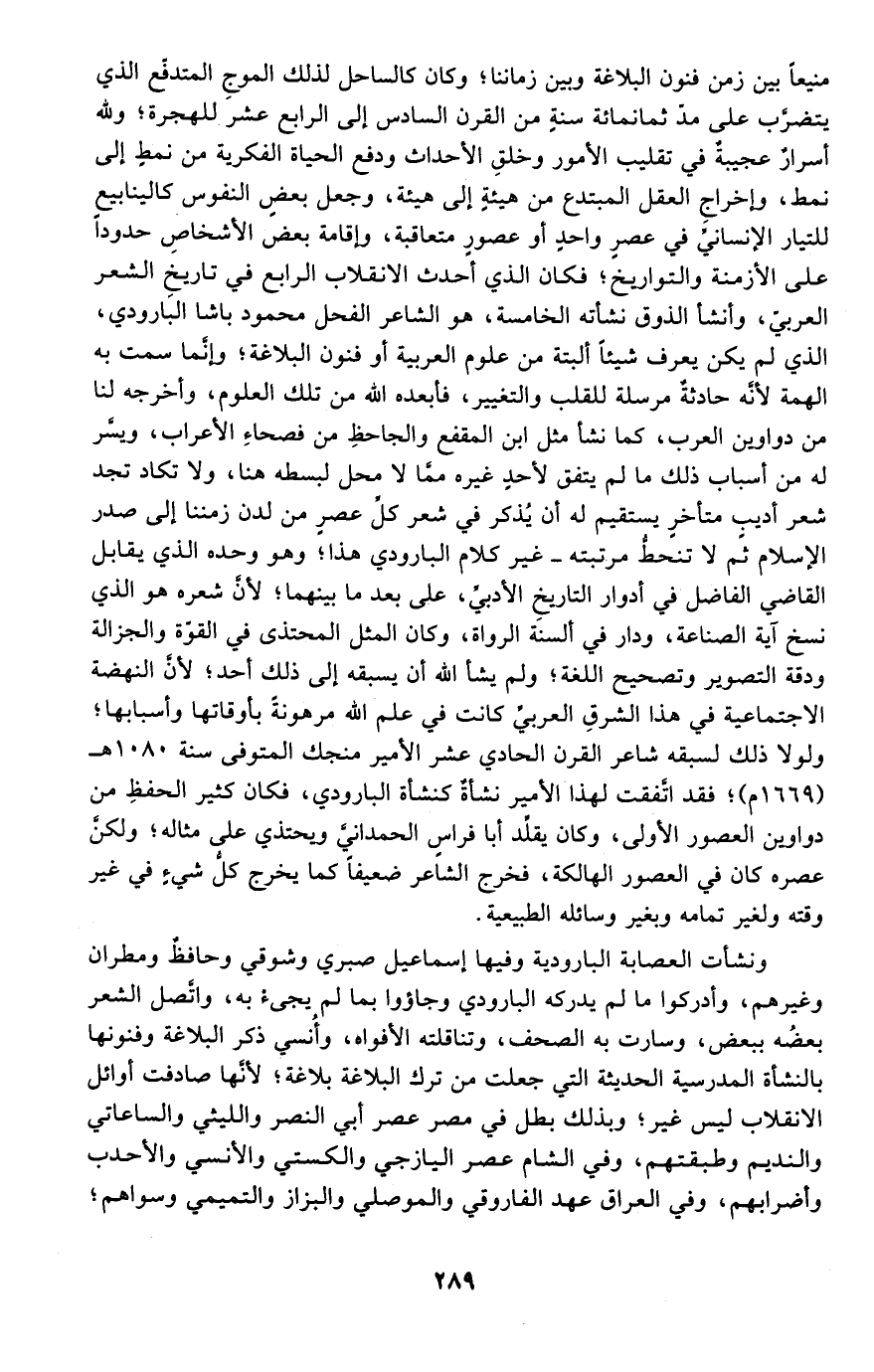 ونشأت العصابة البارودية وفيها إسماعيل صبري وشوقي وحافظ ومطران وغيرهم، وأدركوا ما لم يدركه البارودي وجاءوا بما لم يجئ به، واتصل الشعر بعضه ببعضه، وسارت به الصحف، وتناقلته الأفواه، وأنسي ذكر البلاغة وفنونها بالنشأة المدرسية الحديثة التي جعلت من ترك البلاغة بلاغة؛ لأنها صادفت أوائل الانقلاب ليس غير؛ وبذلك بطل في مصر عصر أبي النصر والليثي والساعاتي والنديم وطبقتهم، وفي الشام عصر اليازجي والكستي والأنسي والأحدب وأضرابهم، وفي العراق عهد الفاروقي والموصلي والبزاز والتميمي وسواهم؛