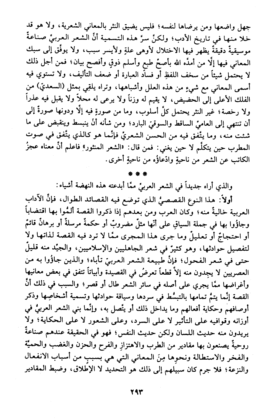 أولًا: هذا النوع القصصي الذي توضع فيه القصائد الطوال، فإن الآداب العربية خالية منه؛ وكان العرب ومن بعدهم إذا ذكروا القصة ألموا بها اقتضابًا وجاءوا بها في جملة السياق على أنها مثل مضروب أو حكمة مرسلة أو برهان قائم أو احتجاج أو تعليل وما جرى هذا المجرى مما لا ترد فيه القصة لذاتها ولا لتفصيل حوادثها؛ وهو كثير في شعر الجاهليين والإسلاميين، والجيد منه قليل حتى في شعر الفحول؛ فإن طبيعة الشعر العربي تأباه؛ والذين جاءوا به من العصريين لا يجدون منه إلا قطعًا تعرض في القصيدة وأبياتًا تتفق في بعض معانيها وأغراضها مما يجري على أصله في سائر الشعر طال أو قصر؛ والسبب في ذلك أن القصة إنما يتم تمامها بالتبسط في سردها وسياقة حوادثها وتسمية أشخاصها وذكر أوصافهم وحكاية أفعالهم وما يداخل ذلك أو يتصل به، وإنما بني الشعر العربي في أوزانه وقوافيه على التأثير لا على السرد، وعلى الشعور لا على الحكاية؛ ولا يريدون منه حديث اللسان ولكن حديث النفس؛ فهو في الحقيقة عندهم صناعة روحية يصنعون بها مقادير من الطرب والاهتزاز والفرح والحزن والغضب والحمية والنزعة؛ فلا جرم كان سبيلهم إلى ذلك هو التحديد لا الإطلاق، وضبط المقادير