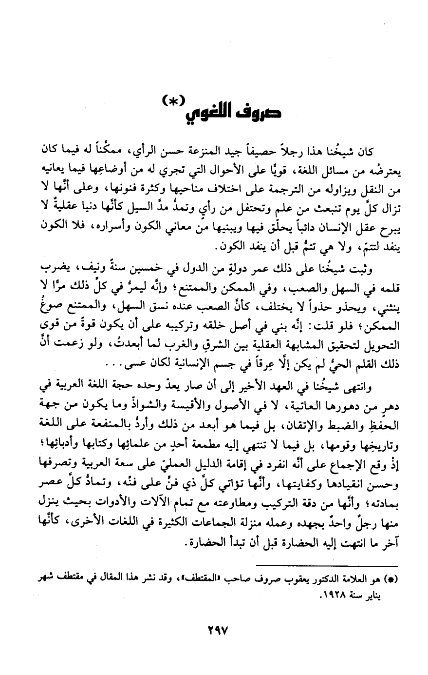 وانتهى شيخنا في العهد الأخير إلى أن صار يعد وحده حجة اللغة العربية في دهر من دهورها العاتية، لا في الأصول والأقيسة والشواذ وما يكون من جهة الحفظ والضبط والإتقان، بل فيما هو أبعد من ذلك وأرد بالمنفعة على اللغة وتاريخها وقومها، بل فيما لا تنتهي إليه مطمعه أحد من علمائها وكتابها وأدبائها؛ إذ وقع الإجماع على أنه انفرد في إقامة الدليل العلمي على سعة العربية وتصرفها وحسن انقيادها وكفايتها، وأنها تؤاتي كل ذي فن على فنه، وتماد كل عصر بمادته؛ وأنها من دقة التركيب ومطاوعته مع تمام الآلات والأدوات بحيث ينزل منها رجل واحد بجهده وعمله منزلة الجماعات الكثيرة في اللغات الأخرى، كأنها آخر ما انتهت إليه الحضارة قبل أن تبدأ الحضارة.