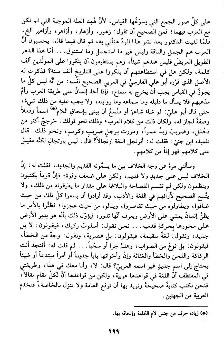 على كل صور الجمع التي يسوغها القياس؛ لأن ههنا الموجبة التي لم تكن مع العرب فيهما؛ فمن الصحيح أن تقول: زهور، وأزهار، وأزاهر، وأزاهير الخ، فلما لقيت الدكتور بعد نشر هذا الرد هنأني به، ثم قال فيما قال: يحسبون أن العرب هم الجمل والناقة وليس غير ما استجمل وما استنوق.. أما هذا الدهر الطويل العريض فليس عندهم شيئًا، وهم يستطيعون أن ينكروا على المولدين ألف كلمة، ولكن هل في استطاعتهم أن ينكروا على التاريخ ألف سنة؟ فذكرت له الأصل الذي قرره أبو علي الفارسي في العربي الصحيح نفسه: من أنه ليس كل ما يجوز في القياس يجب أن يخرج به سماع، فإذا أخذ إنسان على طريقة العرب وأم مذهبهم فلا يسأل ما دليله وما سماعه وما روايته، ولا يجب عليه من ذلك شيء، حتى قال أبو علي: لو شاء شاعر أو متسع أن يبني بإلحاق اللام* اسمًا وفعلًا وصفة لجاز له، ولكان ذلك من كلام العرب؛ وذلك نحو قولك: خرجج أكثر من دخلل، وضربب زيد عمرًا، ومررت برجل ضربب وكرمم، ونحو ذلك. قال تلميذه ابن جني: فقلت له: أترتجل اللغة ارتجالًا؟ قال: ليس بارتجال لكنه مقيس على كلامهم فهو إذًا من كلامهم.