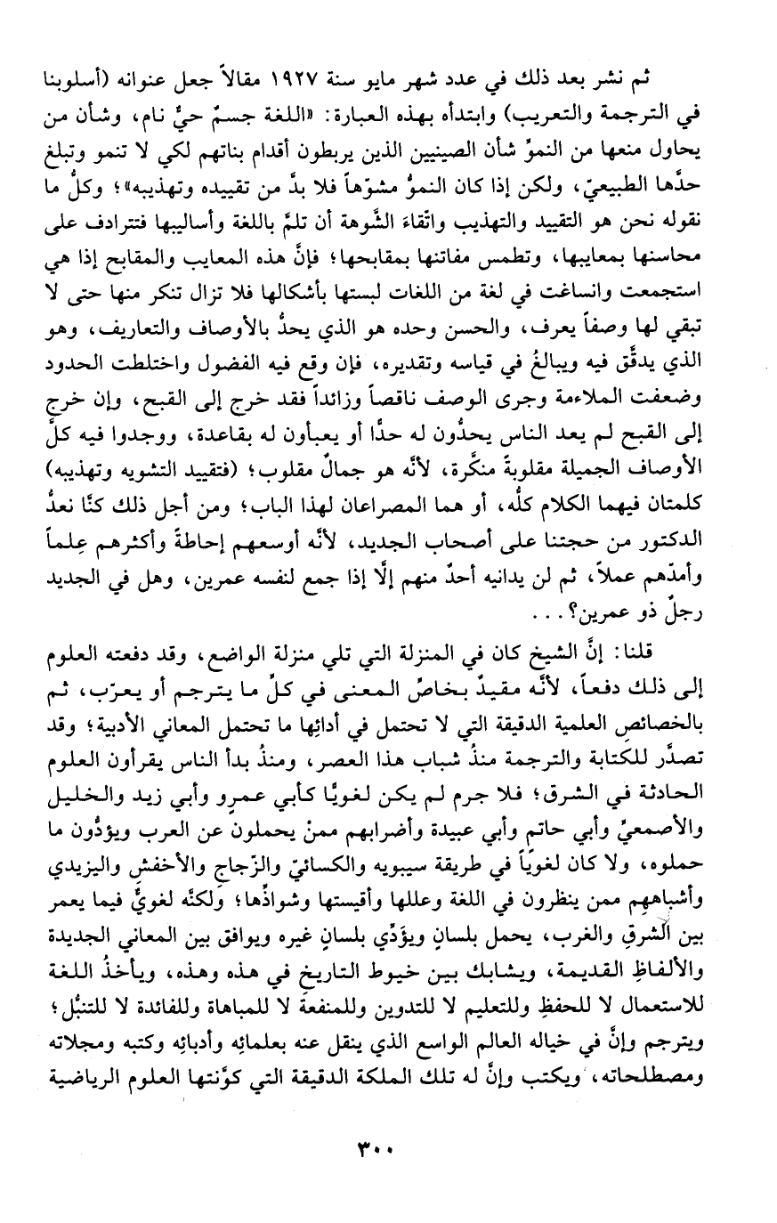 ثم نشر بعد ذلك في عدد شهر مايو سنة 1927 مقالًا جعل عنوانه "أسلوبنا في الترجمة والتعريب" وابتدأه بهذه العبارة: "اللغة جسم حي نامٍ، وشأن من يحاول منعها من النمو شأن الصينيين الذين يربطون أقدام بناتهم لكي لا تنمو وتبلغ حدها الطبيعي، ولكن إذا كان النمو مشوهًا فلا بد من تقييده وتهذيبه؛ وكل ما نقوله نحن هو التقييد والتهذيب واتقاء الشوهة أن تلم باللغة وأساليبها فتترادف على محاسنها بمعايبها، وتطمس مفاتنها بمقابحها؛ فإن هذه المعايب والمقابح إذا هي استجمعت وانساغت في لغة من اللغات لبستها بأشكالها فلا تزال تنكر منها حتى لا تبقي لها وصفًا يعرف، والحسن وحده هو الذي يحد بالأوصاف والتعاريف، وهو الذي يدقق فيه ويبالغ فيه قياسه وتقديره، فإن وقع فيه الفضول واختلطت الحدود وضعفت الملاءمة وجرى الوصف ناقصًا وزائدًا فقد خرج إلى القبح، وإن خرج إلى القبح لم يعد الناس يحدون له حدًّا أو يعبأون له بقاعدة، ووجدوا فيه كل الأوصاف الجميلة مقلوبة منكرة؛ لأنه هو جمال مقلوب؛ "فتقييد التشويه وتهذيبه" كلمتان فيهما الكلام كله، أو هما المصراعان لهذا الباب؛ ومن أجل ذلك كنا نعد الدكتور من حجتنا على أصحاب الجديد؛ لأنه أوسعهم إحاطة وأكثرهم علمًا وأمدهم عملًا، ثم لن يدانيه أحد منهم إلا إذا جمع لنفسه عمرين، وهل في الجديد رجل ذو عمرين؟..