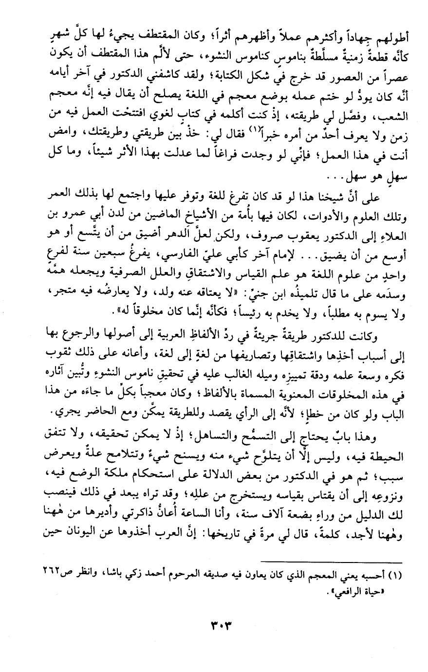 على أن شيخنا هذا لو قد كان تفرغ للغة وتوفر عليها واجتمع لها بذلك العمر وتلك العلوم والأدوات، لكان فيها بأمة من الأشياخ الماضين من لدن أبي عمرو بن العلاء إلى الدكتور يعقوب صروف، ولكن لعل الدهر أضيق من أن يتسع أو هو أوسع من أن يضيق ... لإمام آخر كأبي علي الفارسي، يفرغ سبعين سنة لفرع واحد من علوم اللغة هو علم القياس والاشتقاق والعلل الصرفية ويجعله همه وسدسه على ما قال تلميذه ابن جني: "لا يعتاقه عنه ولد، ولا يعارضه فيه متجر، ولا يسوم به مطلبًا، ولا يخدم به رئيسًا؛ فكأنه إنما كان مخلوقًا له".