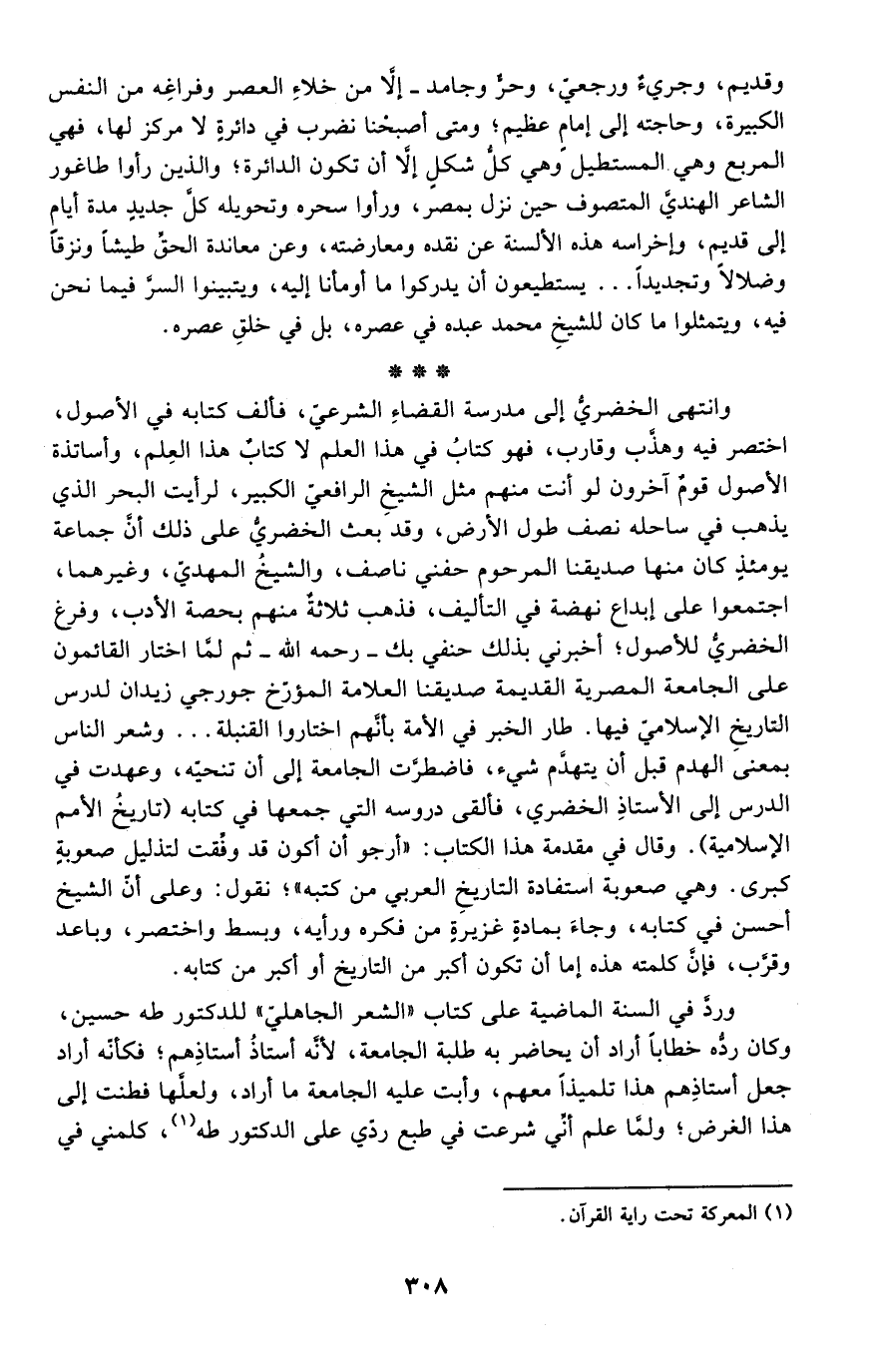 وانتهى الخضري إلى مدرسة القضاء الشرعي، فألف كتابه في الأصول، اختصر فيه وهذب وقارب، فهو كتاب في هذا العلم لا كتاب هذا العلم، وأساتذة الأصول قوم آخرون لو أنت منهم مثل الشيخ الرافعي الكبير، لرأيت البحر الذي يذهب في ساحله نصف طول الأرض، وقد بعث الخضري على ذلك أن جماعة يومئذ كان منها صديقنا المرحوم حفني ناصف، والشيخ المهدي، وغيرهما، اجتمعوا على إبداع نهضة في التأليف، فذهب ثلاثة منهم بحصة الأدب، وفرغ الخضري للأصول؛ أخبرني بذلك حنفي بك -رحمه الله- ثم لما اختار القائمون على الجامعة المصرية القديمة صديقنا العلامة المؤرخ جورجي زيدان لدرس التاريخ الإسلامي فيها. طار الخبر في الأمة بأنهم اختاروا القنبلة.. وشعر الناس بمعنى الهدم قبل أن يتهدم شيء، فاضطرت الجامعة إلى أن تنحيه، وعهدت في الدرس إلى الأستاذ الخضري، فألقى دروسه التي جمعها في كتابه "تاريخ الأمم الإسلامية". وقال في مقدمة هذا الكتاب: "أرجو أن أكون قد وفقت لتذليل صعوبة كبرى. وهي صعوبة استفادة التاريخ العربي من كتبه"؛ نقول: وعلى أن الشيخ أحسن في كتابه، وجاء بمادة غزيرة من فكره ورأيه، وبسط واختصر، وباعد وقرب، فإن كلمته هذه إما أن تكون أكبر من التاريخ أو أكبر من كتابه.