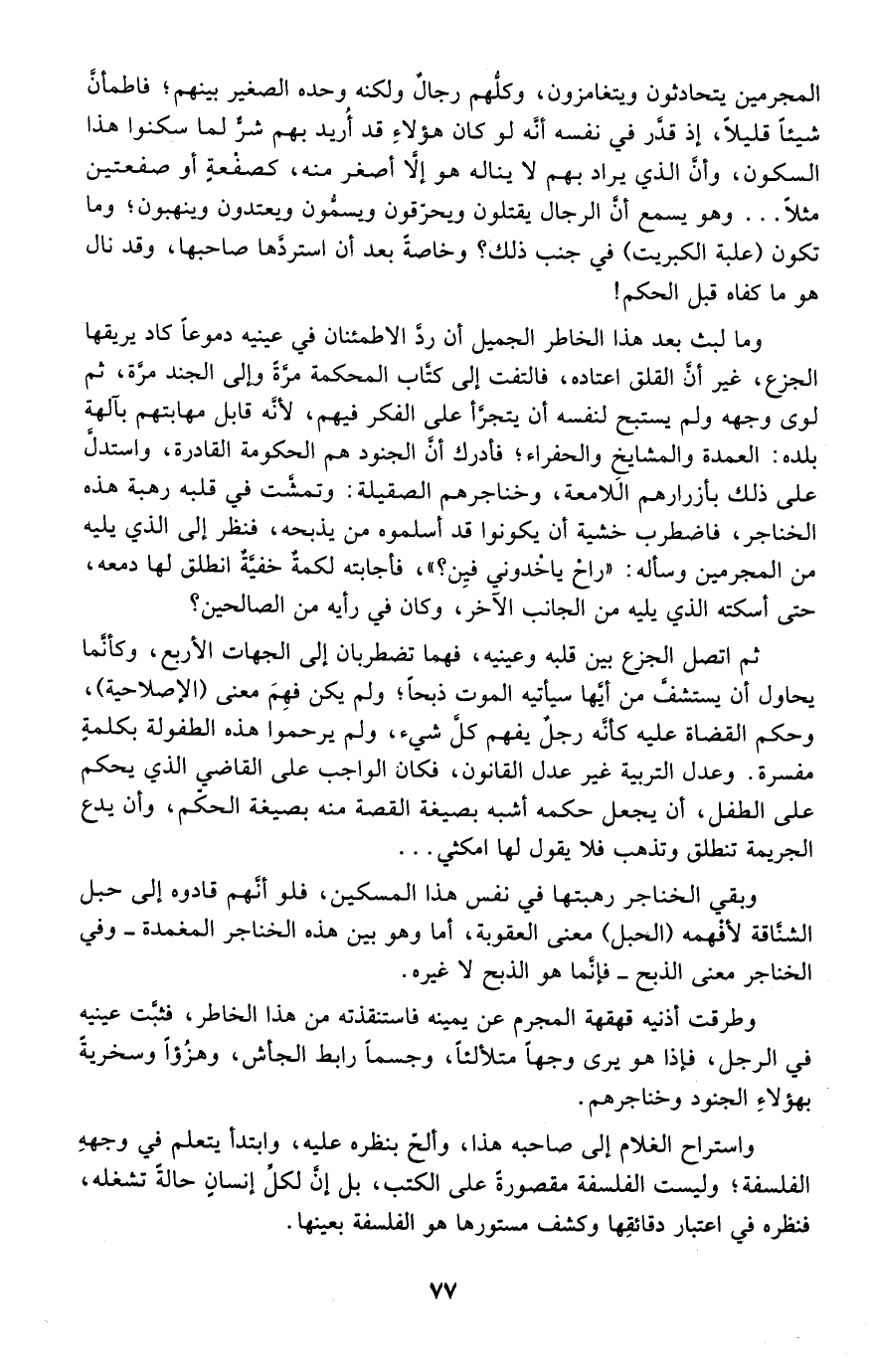 ثم اتصل الجزع بين قلبه وعينيه، فهما تضطربان إلى الجهات الأربع، وكأنما يحاول أن يستشف من أيها سيأتيه الموت ذبحًا؛ ولم يكن فهم معنى "الإصلاحية"، وحكم القضاة عليه كأنه رجل يفهم كل شيء، ولم يرحموا هذه الطفولة بكلمة مفسرة، وعدل التربية غير عدل القانون، فكان الواجب على القاضي الذي يحكم على الطفل، أن يجعل حكمه أشبه بصيغة القصة منه بصيغة الحكم، وأن يدع الجريمة تنطلق وتذهب فلا يقول لها امكثي..