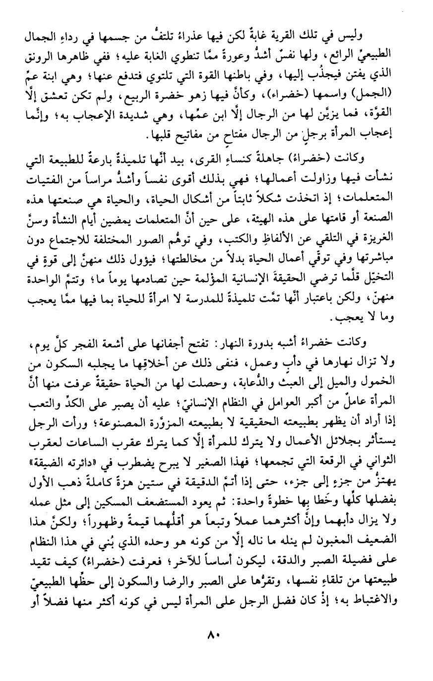 وكانت خضراء أشبه بدورة النهار: تفتح أجفانها على أشعة الفجر كل يوم، ولا تزال نهارها في دأب وعمل، فنفى ذلك عن أخلاقها ما يجلبه السكون من الخمول والميل إلى العبث والدعابة، وحصلت لها من الحياة حقيقة عرفت منها أن المرأة عامل من أكبر العوامل في النظام الإنساني؛ عليه أن يصبر على الكد والتعب إذا أراد أن يظهر بطبيعته الحقيقية لا بطبيعته المزورة المصنوعة؛ ورأت الرجل يستأثر بجلائل الأعمال ولا يترك للمرأة إلا كما يترك عقرب الساعات لعقرب الثواني في الرقعة التي تجمعها؛ فهذا الصغير لا يبرح يضطرب في "دائرته الضيقة" يهتز من جزء إلى جزء، حتى إذا أتم الدقيقة في ستين هزة كاملة ذهب الأول بفضلها كلها وخطا بها خطوة واحدة: ثم يعود المستضعف المسكين إلى مثل عمله ولا يزال دأبهما وإن أكثرهما عملًا وتبعًا هو أقلهما قيمة وظهورًا؛ ولكن هذا الضعيف المغبون لم ينله ما ناله إلا من كونه هو وحده الذي بني في هذا النظام على فضيلة الصبر والدقة، ليكون أساسًا للآخر؛ فعرفت "خضراء" كيف تقيد طبيعتها من تلقاء نفسها، وتقرها على الصبر والرضا والسكون إلى حظها الطبيعي والاغتباط به؛ إذ كان فضل الرجل على المرأة ليس في كونه أكثر منها فضلًا أو