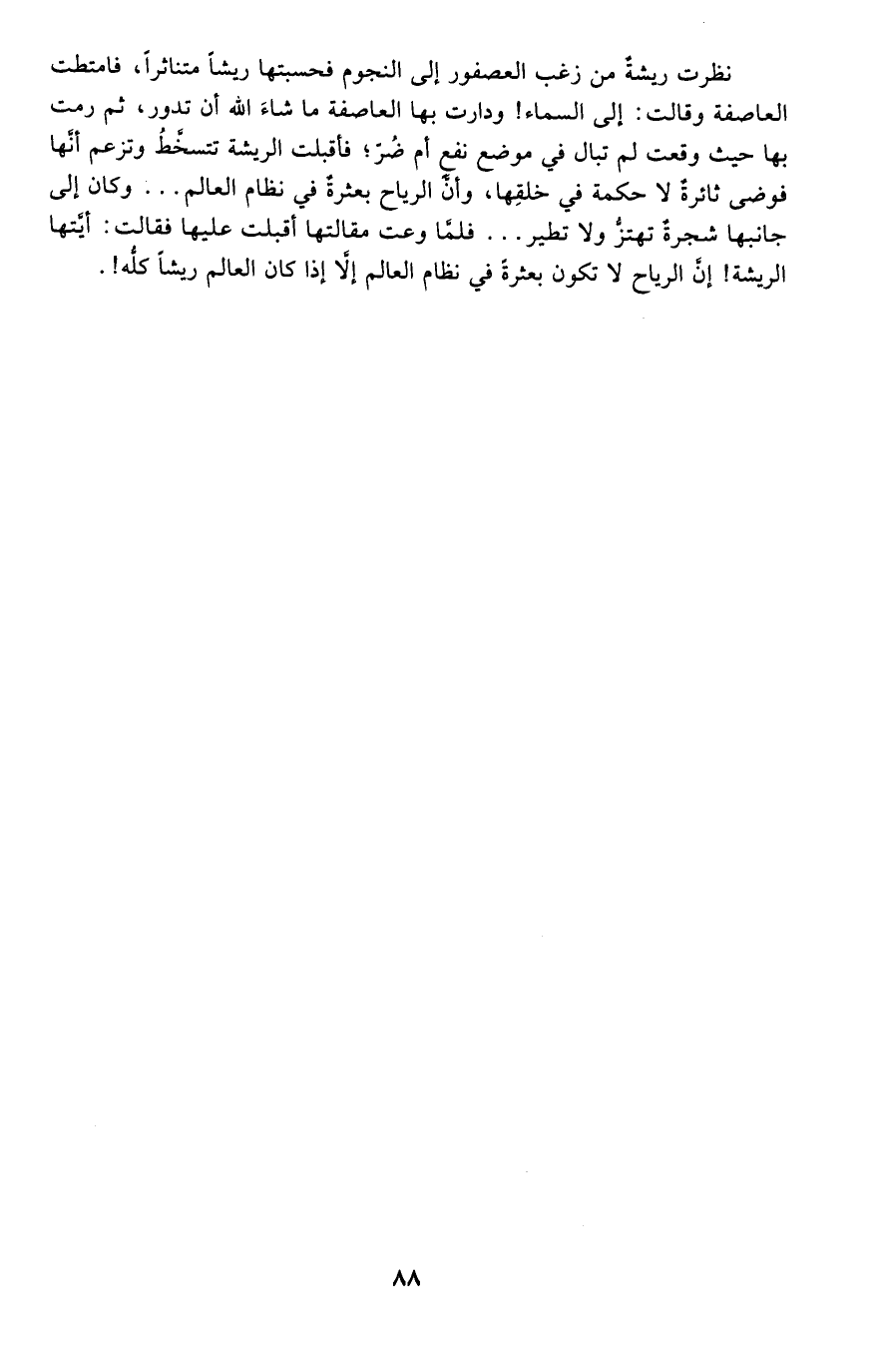 نظرت ريشة من زغب العصفور إلى النجوم فحسبتها ريشًا متناثرًا، فامتطت العاصفة وقالت: إلى السماء! ودارت بها العاصفة ما شاء الله أن تدور، ثم رمت بها حيث وقعت لم تبال في موضع نفع أم ضر؛ فأقبلت الريشة تتسخط وتزعم أنها فوضى ثائرة لا حكمة في خلقها، وأن الرياح بعثرة في نظام العالم ... وكان إلى جانبها شجرة تهتز ولا تطير ... فلما وعت مقالتها أقبلت عليها فقالت: أيتها الريشة! إن الرياح لا تكون بعثرة في نظام العالم إلا إذا كان العالم ريشًا كله!