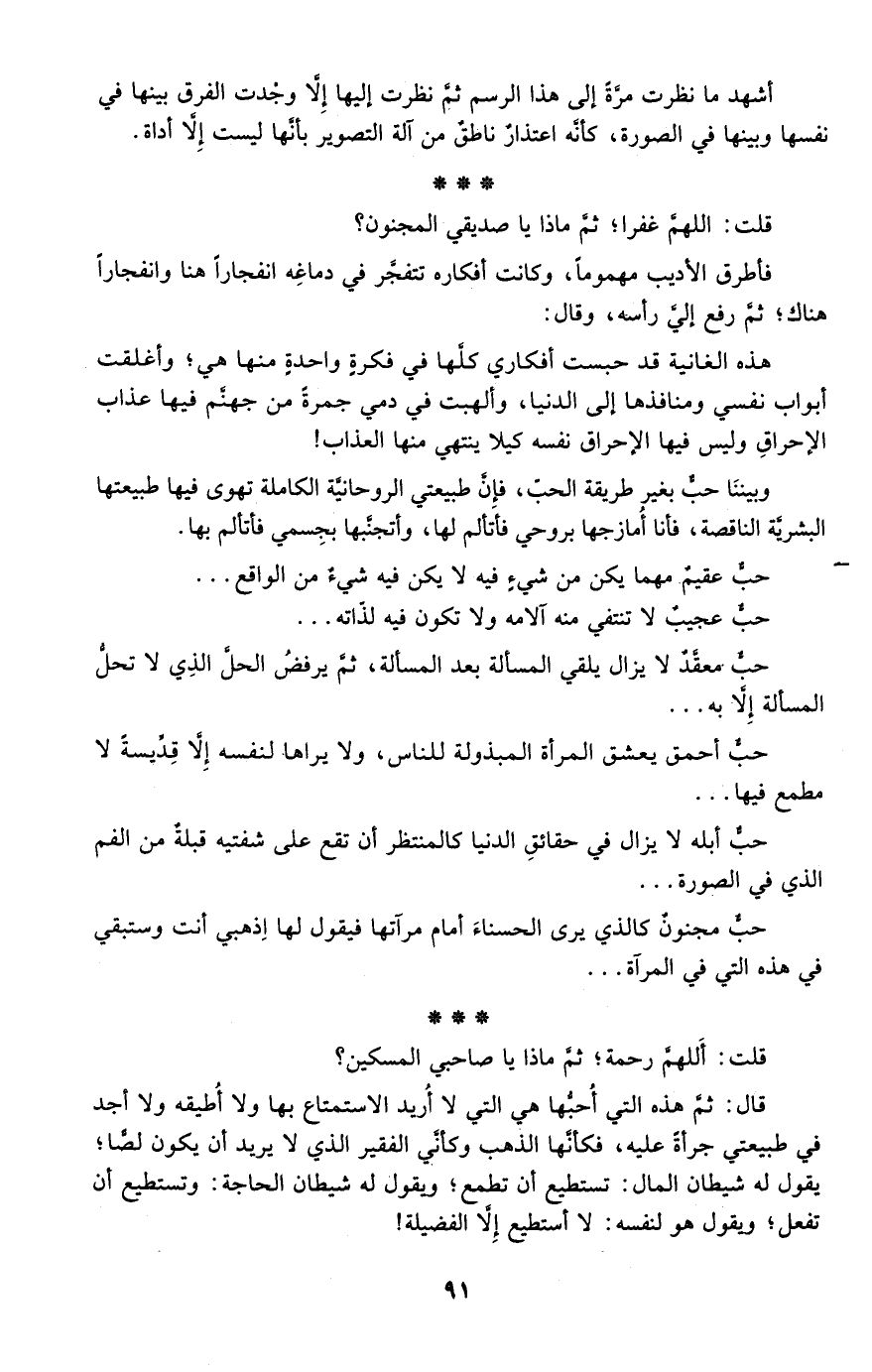قال: ثم هذه التي أحبها هي التي لا أريد الاستمتاع بها ولا أطيقه ولا أجد في طبيعتي جرأة عليه، فكأنها الذهب وكأني الفقير الذي لا يريد أن يكون لصًّا؛ يقول له شيطان المال: تستطيع أن تطمع؛ ويقول له شيطان الحاجة: وتستطيع أن تفعل؛ ويقول هو لنفسه: لا أستطيع إلا الفضيلة!