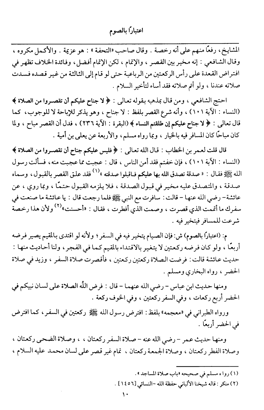 قال: قلت لعمر بن الخطاب: قال الله تعالى: {فَلَيْسَ عَلَيْكُمْ جُنَاحٌ أَنْ تَقْصُرُوا مِنَ الصَّلَاةِ} [النساء: 101] (النساء: الآية 101) ، فإن خفتم فقد أمن الناس، قال: عجبت مما عجبت منه، فسألت رسول الله - صَلَّى اللَّهُ عَلَيْهِ وَسَلَّمَ - فقال: "صدقة تصدق الله بها عليكم فاقبلوا صدقته» فقد علق القصر بالقبول، وسماه صدقة، والمتصدق عليه مخير في قبول الصدقة، فلا يلزمه القبول حتما، وبما «روي عن عائشة - رَضِيَ اللَّهُ عَنْهَا - قالت: سافرت مع النبي - صَلَّى اللَّهُ عَلَيْهِ وَسَلَّمَ - فلما رجعت قال: يا عائشة ما صنعت في سفرك، ما أتممت الذي قصرت، وصمت الذي أفطرت، فقال: "أحسنت» ولأن هذا رخصة شرعت للمسافر فيتخير فيه.
