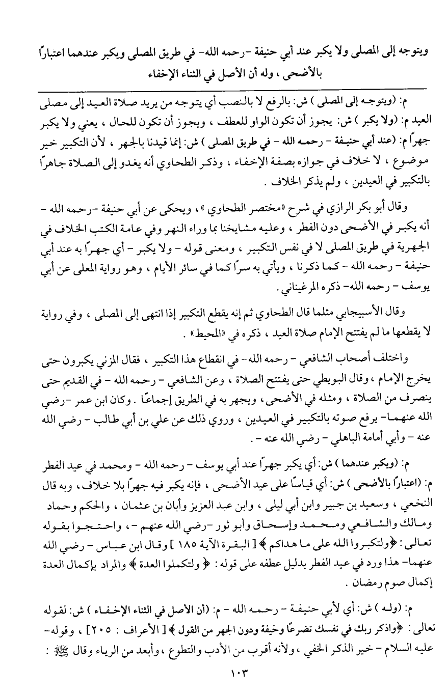 وقال أبو بكر الرازي في شرح " مختصر الطحاوي " ويحكى عن أبي حنيفة - رَحِمَهُ اللَّهُ - أنه يكبر في الأضحى دون الفطر وعليه مشايخنا بما وراء النهر، وفي عامة الكتب الخلاف في الجهرية في طريق المصلى لا في نفس التكبير، ومعنى قوله - ولا يكبر - أي جهرا به عند أبي حنيفة - رَحِمَهُ اللَّهُ - كما ذكرنا، ويأتي به سرا كما في سائر الأيام، وهو رواية المعلى عن أبي يوسف - رَحِمَهُ اللَّهُ - ذكره المرغيناني.