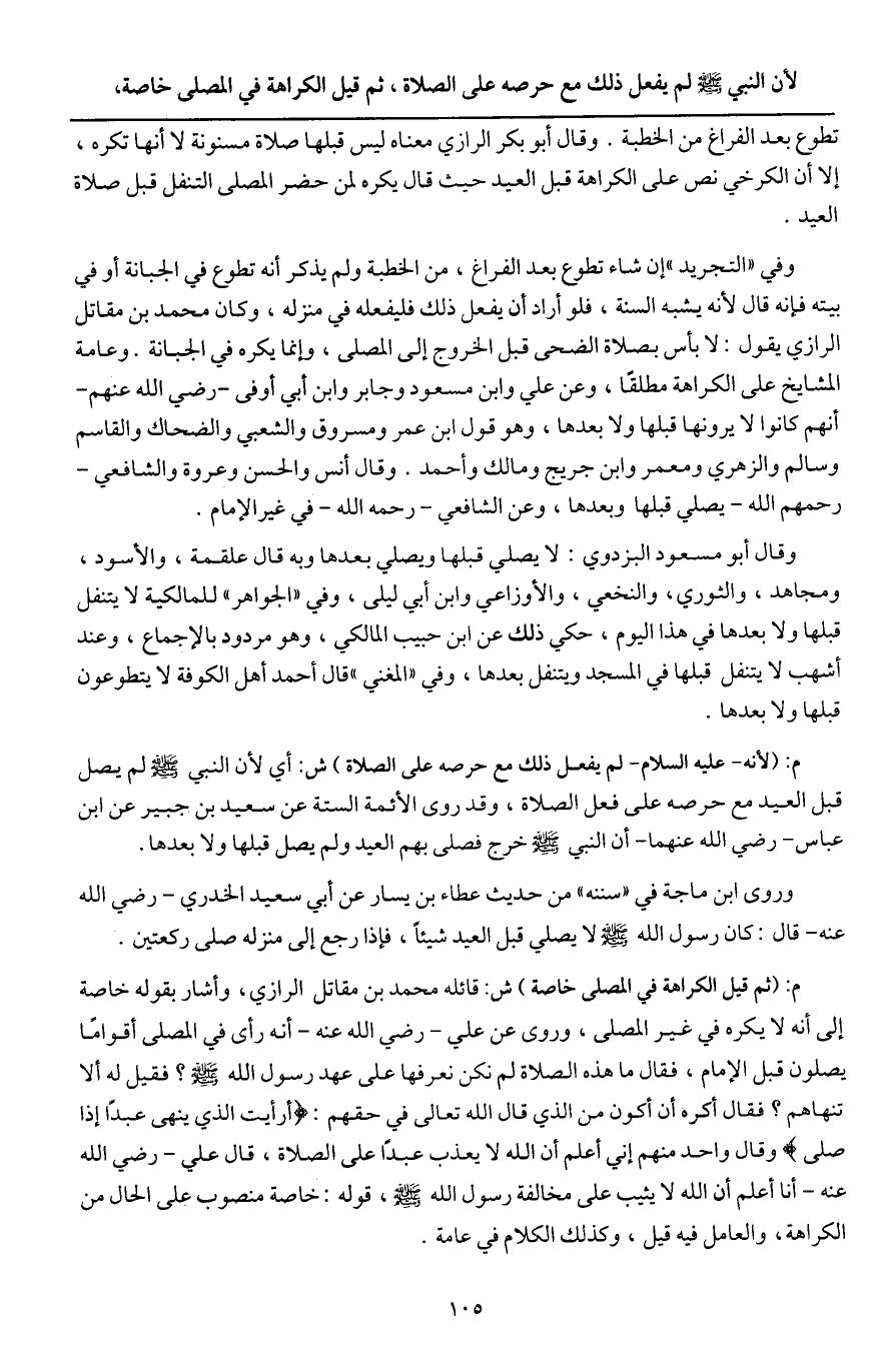 لأن النبي - صَلَّى اللَّهُ عَلَيْهِ وَسَلَّمَ - لم يفعل ذلك مع حرصه على الصلاة، ثم قيل: الكراهة في المصلى خاصة،