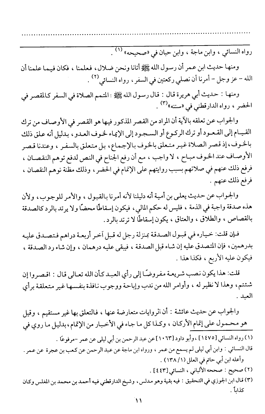ومنها «حديث ابن عمر أن رسول الله - صَلَّى اللَّهُ عَلَيْهِ وَسَلَّمَ - أتانا ونحن ضلال، فعلمنا، فكان فيما علمنا أن الله - عز وجل- أمرنا أن نصلي ركعتين في السفر» رواه النسائي.
