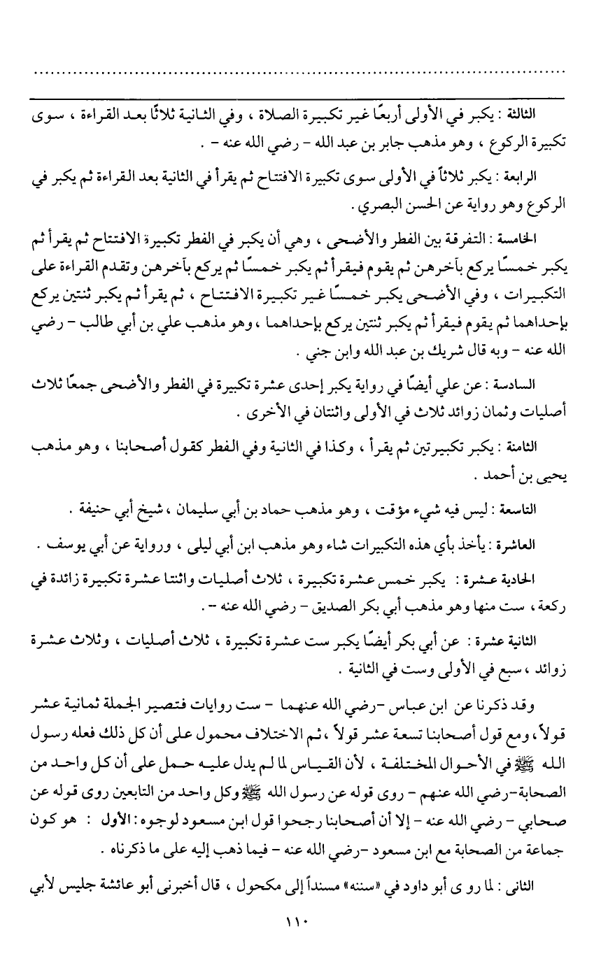 الحادية عشرة: يكبر خمس عشرة تكبيرة، ثلاث أصليات واثنتا عشرة تكبيرة زائدة في ركعة، ست منها وهو مذهب أبي بكر الصديق - رَضِيَ اللَّهُ عَنْهُ -.