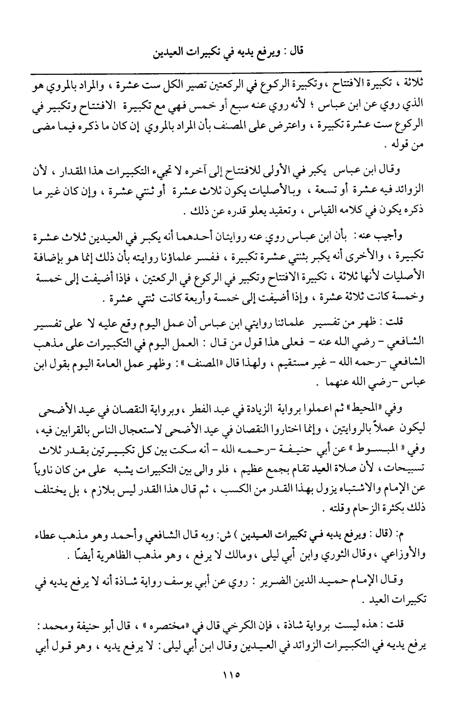 وقال الإمام حميد الدين الضرير: روي عن أبي يوسف رواية شاذة أنه لا يرفع يديه في تكبيرات العيد.