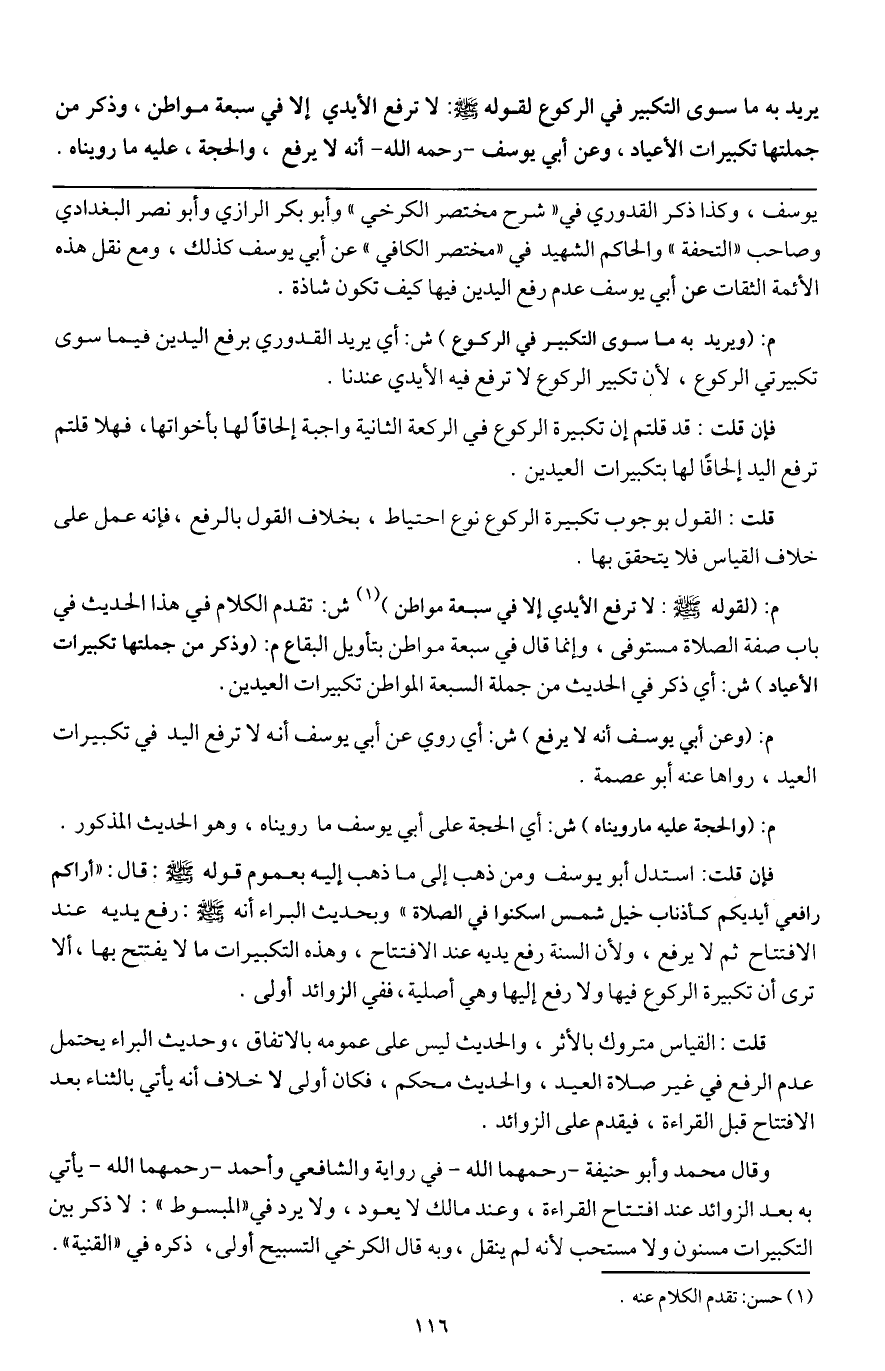 ـــــــــــــــــــــــــــــQيوسف، وكذا ذكر القدوري في " شرح مختصر الكرخي " وأبو بكر الرازي وأبو نصر البغدادي وصاحب " التحفة " والحاكم الشهيد في " مختصر الكافي " عن أبي يوسف كذلك، ومع نقل هذه الأئمة الثقات عن أبي يوسف عدم رفع اليدين فيها كيف تكون شاذة.