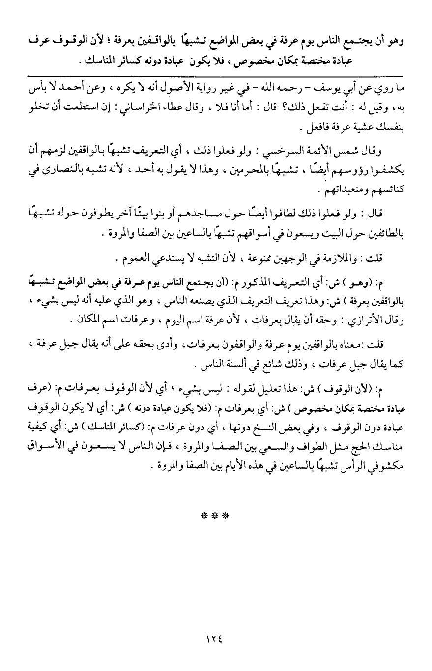 وقال شمس الأئمة السرخسي: ولو فعلوا ذلك، أي التعريف تشبها بالواقفين لزمهم أن يكشفوا رءوسهم أيضا، تشبها بالمحرمين، وهذا لا يقول به أحد، لأنه تشبه بالنصارى في كنائسهم ومتعبداتهم.