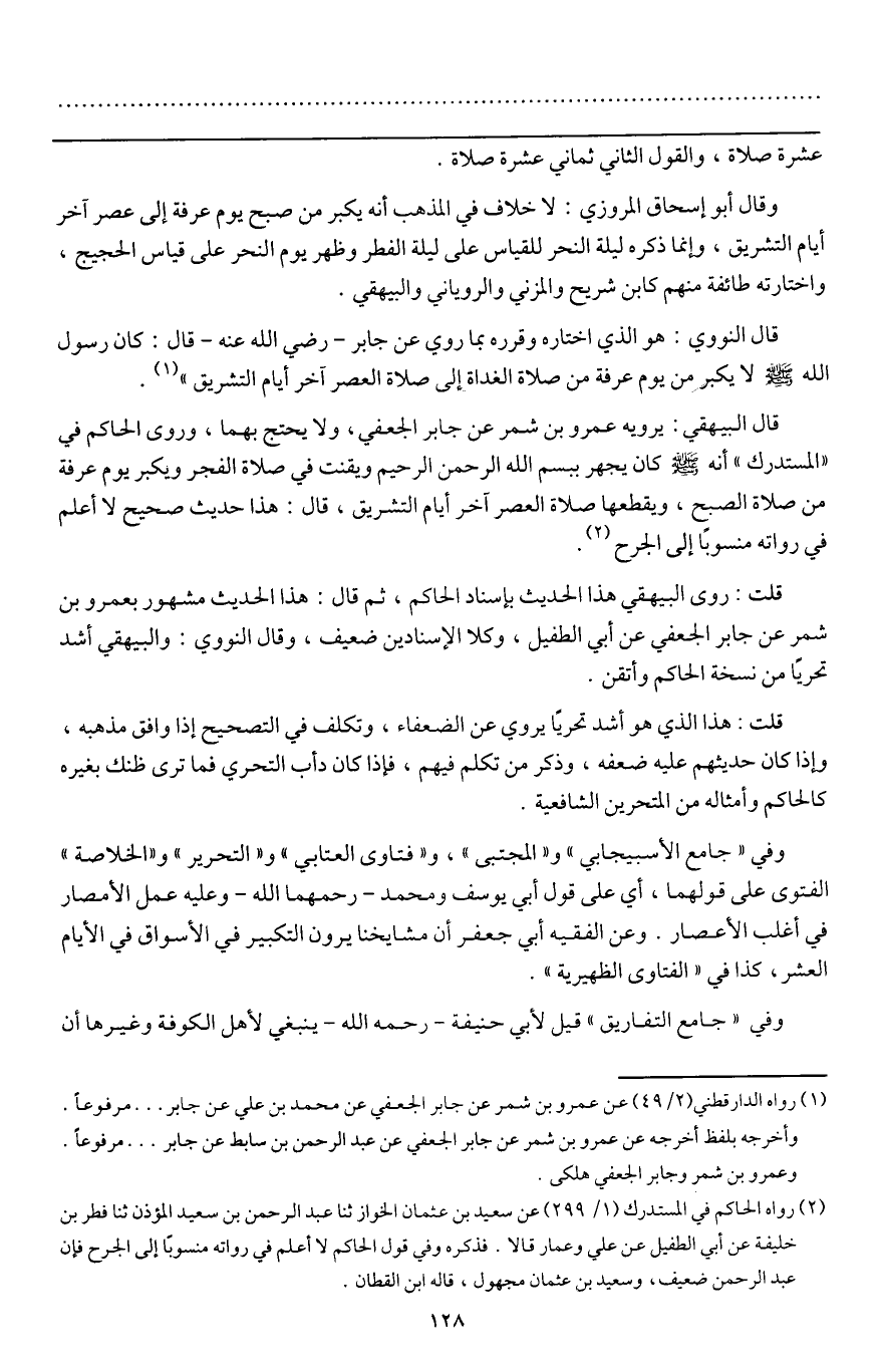 قال البيهقي: يرويه عمرو بن شمر عن جابر الجعفي، ولا يحتج بهما، وروى الحاكم في " المستدرك «أنه - صَلَّى اللَّهُ عَلَيْهِ وَسَلَّمَ - كان يجهر ب " {بِسْمِ اللَّهِ الرَّحْمَنِ الرَّحِيمِ} [الفاتحة: 1] " ويقنت في صلاة الفجر ويكبر يوم عرفة من صلاة الصبح، ويقطعها صلاة العصر آخر أيام التشريق» قال: هذا حديث صحيح لا أعلم في رواته منسوبا إلى الجرح.