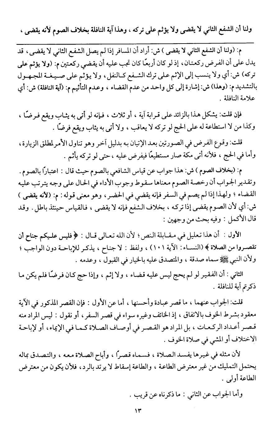 الأول: أن هذا تعليل في مقابلة النص؛ لأن الله تعالى قال: {فَلَيْسَ عَلَيْكُمْ جُنَاحٌ أَنْ تَقْصُرُوا مِنَ الصَّلَاةِ} [النساء: 101] (النساء: الآية 101) ، ولفظ: لا جناح، يذكر للإباحة دون الواجب، ولأن النبي - صَلَّى اللَّهُ عَلَيْهِ وَسَلَّمَ - سماه صدقة، والمتصدق عليه بالخيار في القبول، وعدمه.